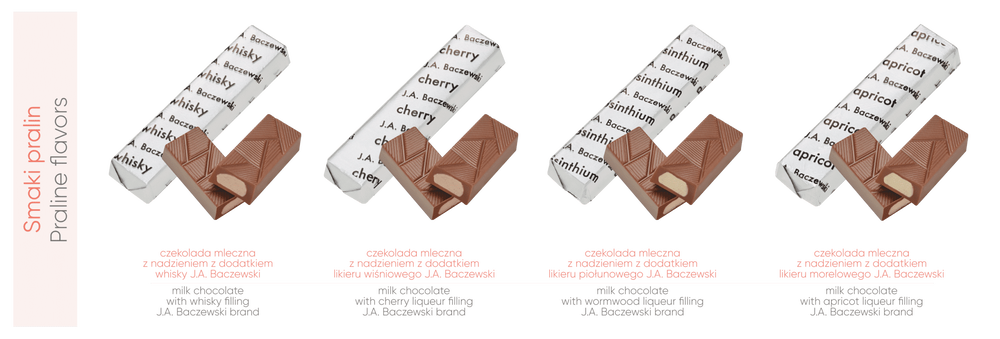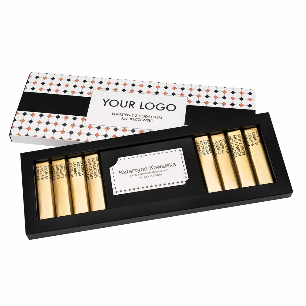 Wyjątkowy zestaw czekoladek z nadzieniem alkoholowym, idealny jako prezent świąteczny dla klientów i partnerów biznesowych. Praliny przygotowane według autorskiej receptury na bazie czekolady i alkoholi J.A. Baczewski.