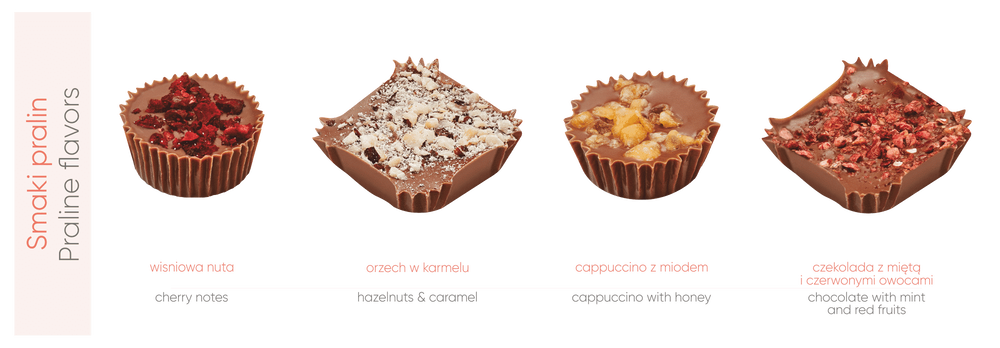 Zestaw 8 nadziewanych czekoladek o wyrafinowanych smakach: wiśnia, cappuccino z miodem, orzech w karmelu, czekolada z miętą i maliną. Idealny prezent firmowy podkreślający elegancję i szacunek dla klientów i partnerów.
