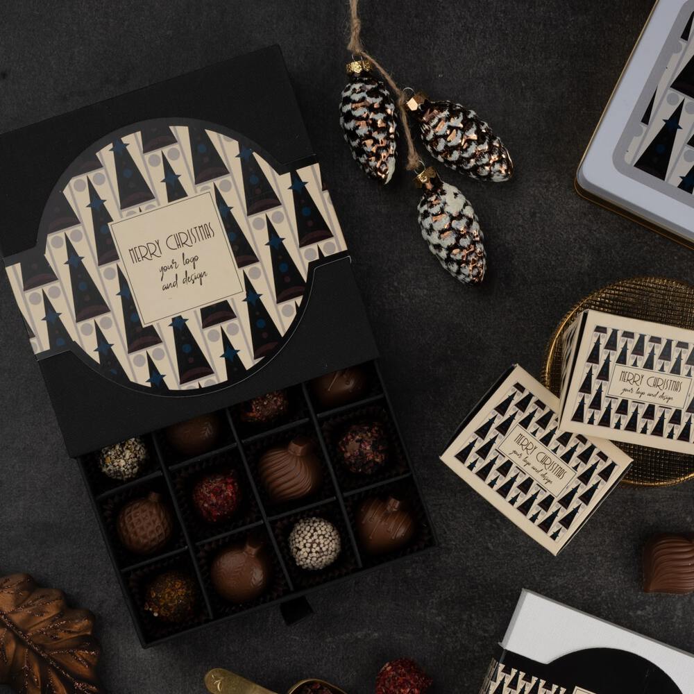 Zestaw 8 bombek i 8 trufli Art Deco (160 g) w eleganckim czarnym pudełku. Idealny prezent firmowy, który łączy świąteczny urok z wyrafinowanym smakiem.