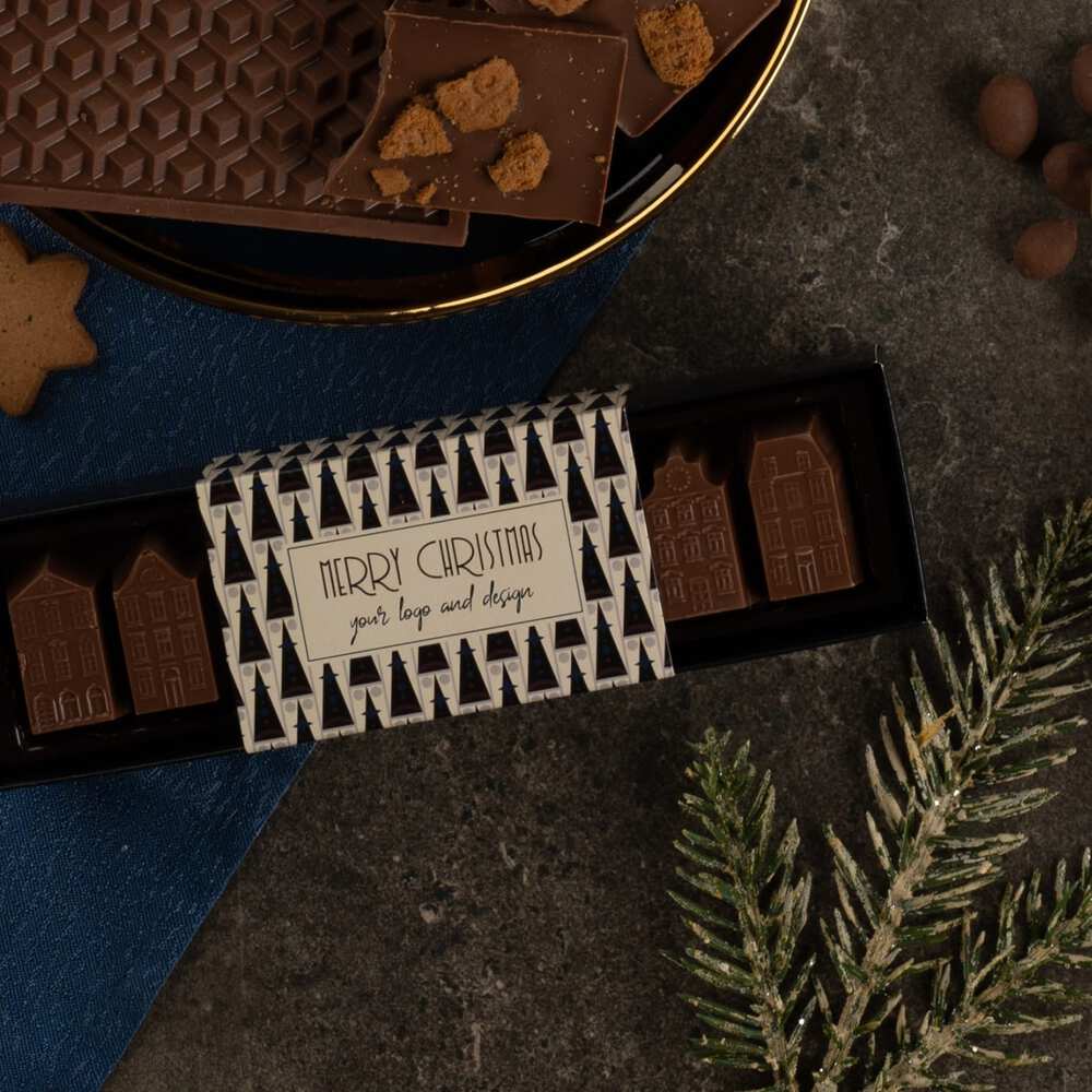 Świąteczne pralinki z logo w kształcie kamieniczek to wyjątkowy prezent na Boże Narodzenie. Każda pralina to małe dzieło sztuki, idealne dla współpracowników i partnerów biznesowych.