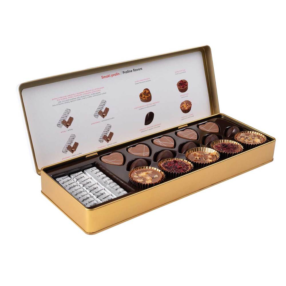 - Czekolada mleczna z nadzieniem whisky, morelówki, wiśniówki i piołunówki
