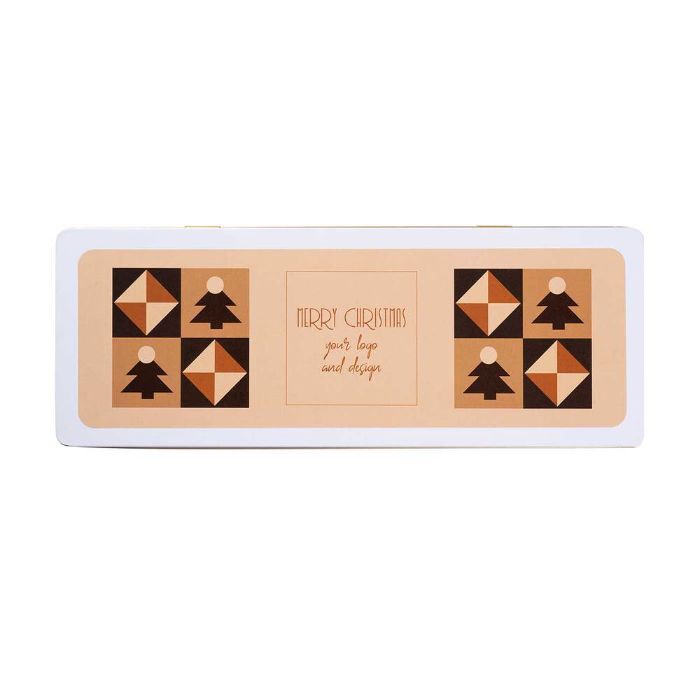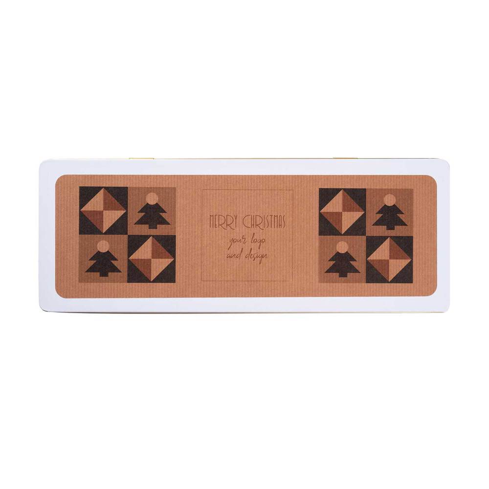 Biało-złota puszka z możliwością personalizacji (etykieta z papieru białego, kraft, ecru lub pergamin) podkreśla elegancję. Opakowanie zero waste można ponownie wykorzystać. PRALINY W PUSZCE PREMIUM to wyjątkowy i smakowity prezent, który wyróżnia firmę.
