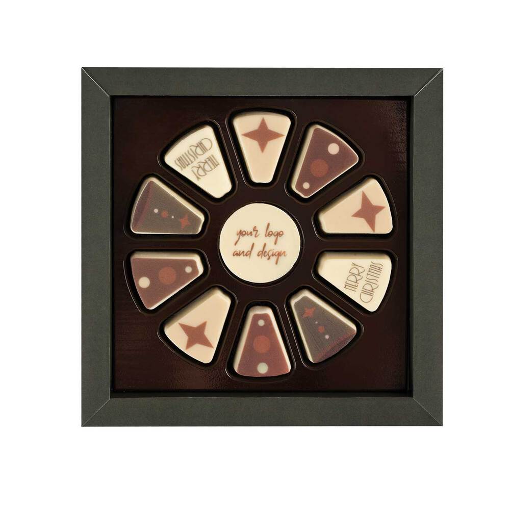Praliny Grand Celebration Cake – zestaw 11 eleganckich czekoladek z nadzieniem z białej czekolady i kremu szampańskiego. Każda pralina może być spersonalizowana nadrukiem, np. logo firmy lub świąteczne motywy.
