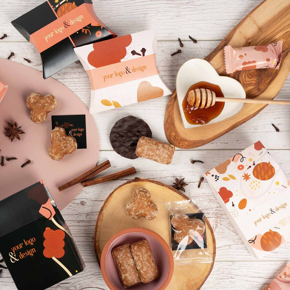 Pierniki pakowane indywidualnie w folię kompostowalną lub monofolię w 100% nadającą się do recyklingu. Opakowanie spersonalizowane z logo lub nową grafiką. Doskonałe jako prezenty firmowe lub poczęstunek na imprezach branżowych.