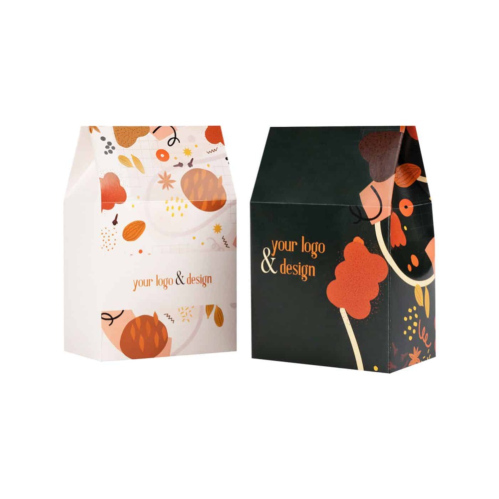 Torebka z certyfikowanego papieru FSC w kolorze biały, kraft lub écru z włóknami trawy, zdobiona grafiką Poli Augustynowicz. Każdy piernik pakowany indywidualnie w folię kompostowalną. Możliwość personalizacji opakowania logo lub nowym projektem graficznym.