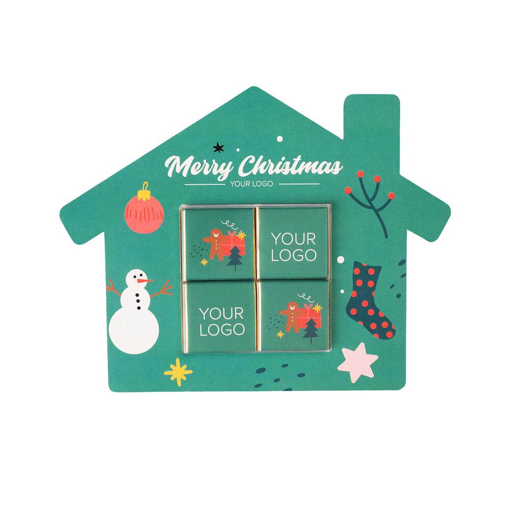 Zestaw czekoladek kwadratowych w kopercie kształtowej – domek to 4 mleczne czekoladki z belgijskiej, certyfikowanej czekolady. Produkt oferuje wiele możliwości personalizacji opakowania.