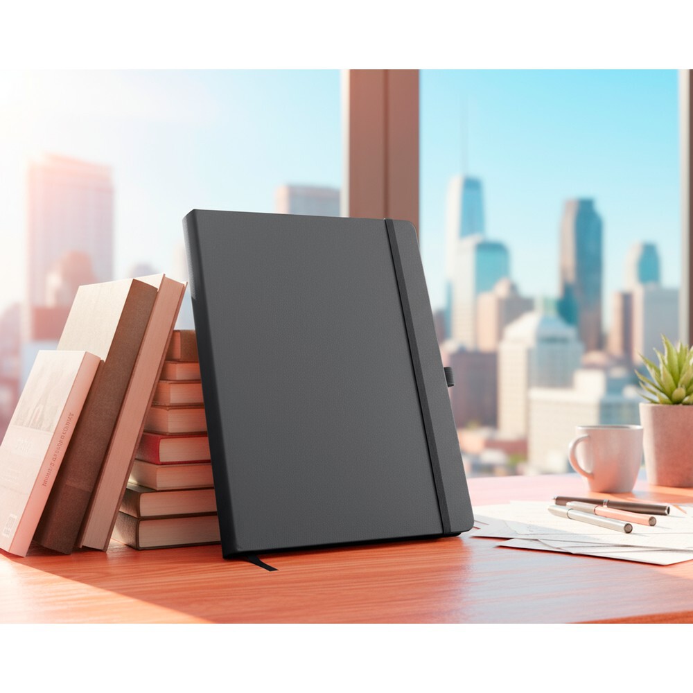 Notatnik w formacie ok. A4, posiada 96 kartek w linie (70 gsm), tasiemka zakładkowa umożliwia wygodne zaznaczanie ostatniej strony lub ważniejszych notatek, dodatkowy gumowy uchwyt na długopis, twarda okładka wykonana z PU