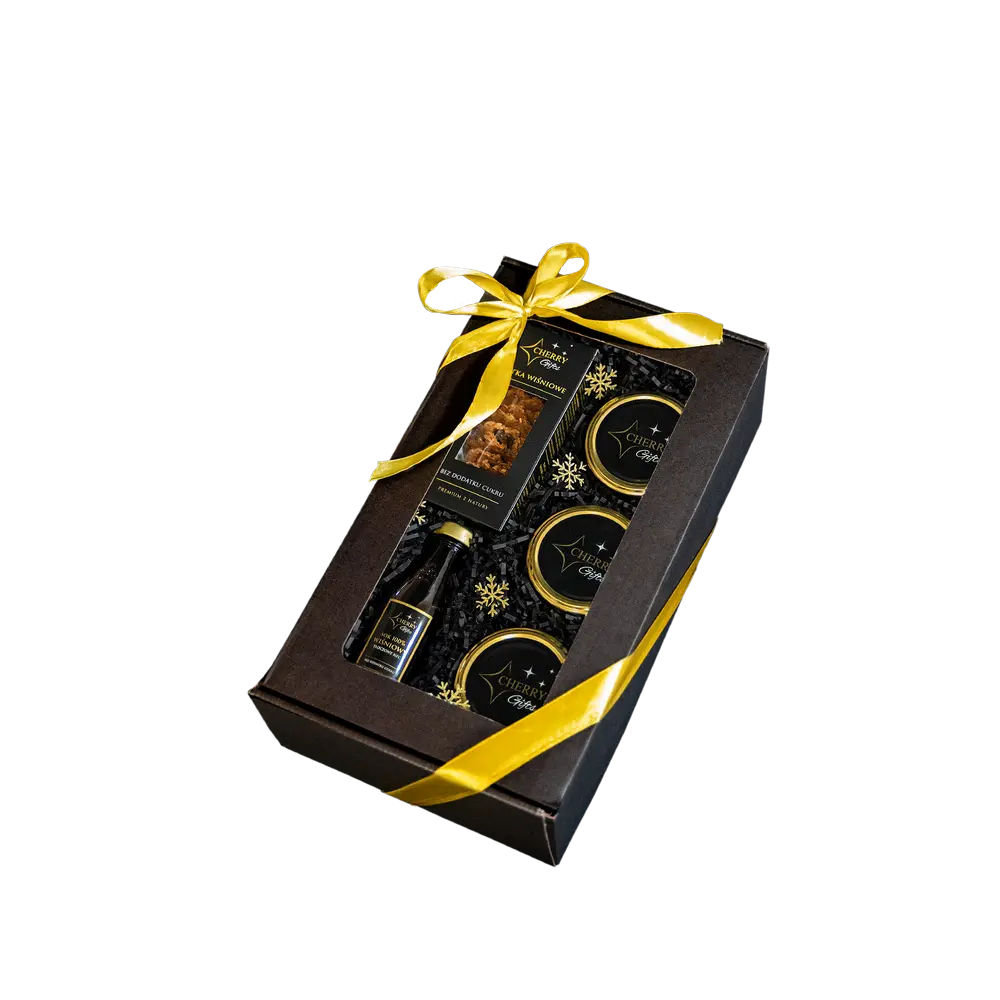 Całość zamknięta w czarno-złotej oprawie ze złotymi śnieżynkami i elegancką wstążką emanuje stylem i luksusem. To doskonała propozycja na prezent świąteczny, firmowy lub upominek dla konesera wiśniowych smaków.