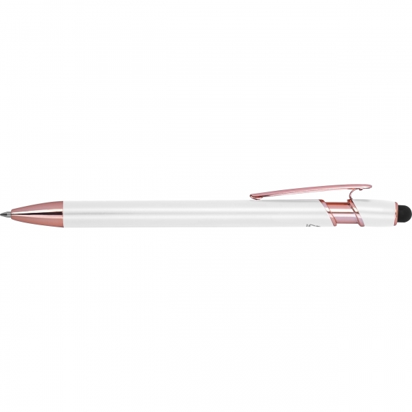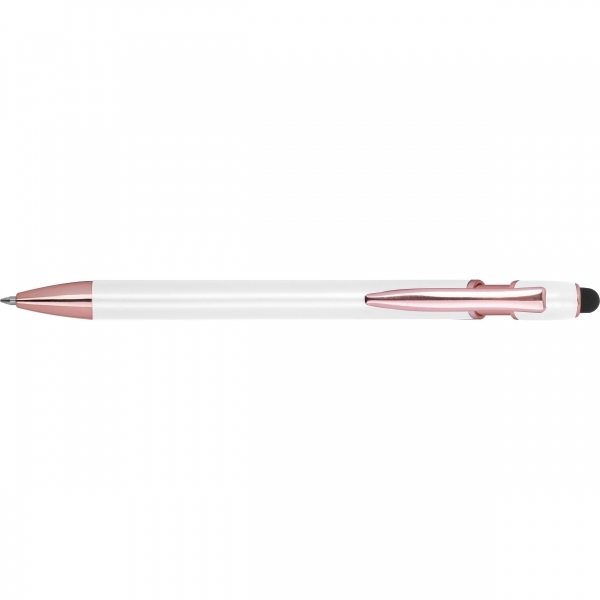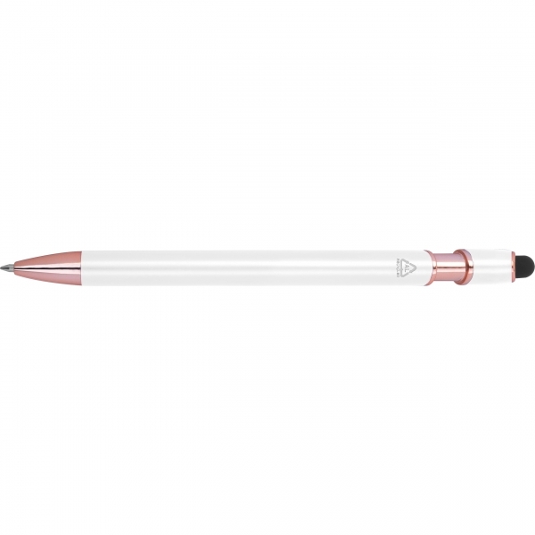 Długopis Belo Horizonte to elegancki gadżet, który łączy nowoczesną technologię z troską o środowisko. Korpus wykonany z recyklingowanego aluminium gwarantuje trwałość i lekkość, a subtelny design sprawia, że długopis prezentuje się wyjątkowo estetycznie.Wyposażony w żelowy wkład o wysokiej pojemności w kolorze niebieskim, umożliwia płynne i komfortowe pisanie. Dodatkowo pełni rolę touch pena, pozwalając na wygodne obsługiwanie ekranów dotykowych w smartfonach i tabletach - idealne połączenie analogowej pisowni i cyfrowej wygody.To doskonały wybór dla tych, którzy szukają praktycznego i eleganckiego długopisu - zarówno do codziennego użytku, jak i jako subtelny, ekologiczny gadżet reklamowy, który z przyjemnością będzie się używać.