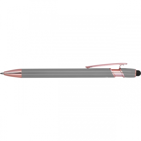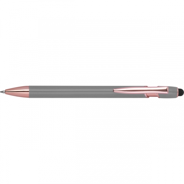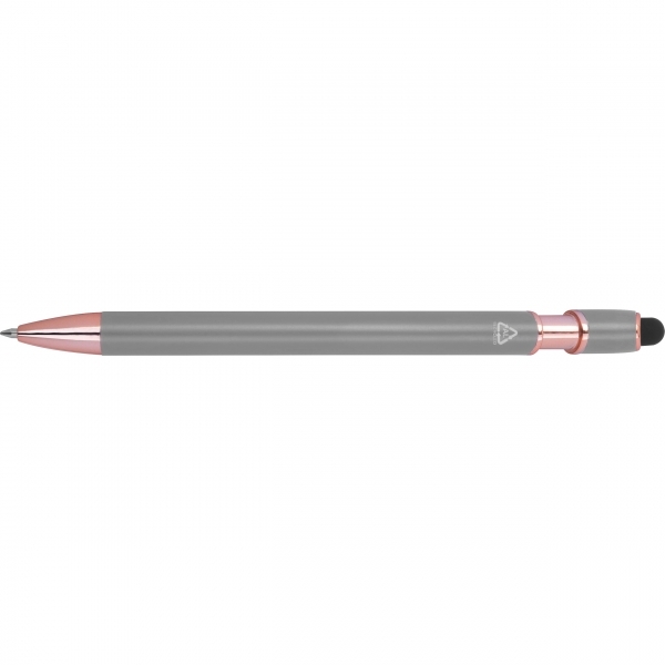 Długopis Belo Horizonte to elegancki gadżet, który łączy nowoczesną technologię z troską o środowisko. Korpus wykonany z recyklingowanego aluminium gwarantuje trwałość i lekkość, a subtelny design sprawia, że długopis prezentuje się wyjątkowo estetycznie.Wyposażony w żelowy wkład o wysokiej pojemności w kolorze niebieskim, umożliwia płynne i komfortowe pisanie. Dodatkowo pełni rolę touch pena, pozwalając na wygodne obsługiwanie ekranów dotykowych w smartfonach i tabletach - idealne połączenie analogowej pisowni i cyfrowej wygody.To doskonały wybór dla tych, którzy szukają praktycznego i eleganckiego długopisu - zarówno do codziennego użytku, jak i jako subtelny, ekologiczny gadżet reklamowy, który z przyjemnością będzie się używać.