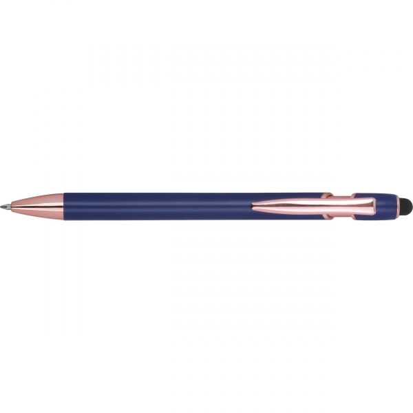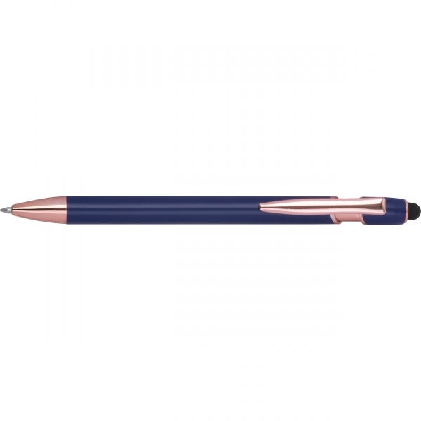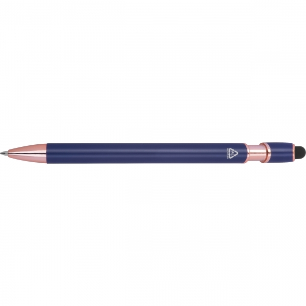 Długopis Belo Horizonte to elegancki gadżet, który łączy nowoczesną technologię z troską o środowisko. Korpus wykonany z recyklingowanego aluminium gwarantuje trwałość i lekkość, a subtelny design sprawia, że długopis prezentuje się wyjątkowo estetycznie.Wyposażony w żelowy wkład o wysokiej pojemności w kolorze niebieskim, umożliwia płynne i komfortowe pisanie. Dodatkowo pełni rolę touch pena, pozwalając na wygodne obsługiwanie ekranów dotykowych w smartfonach i tabletach - idealne połączenie analogowej pisowni i cyfrowej wygody.To doskonały wybór dla tych, którzy szukają praktycznego i eleganckiego długopisu - zarówno do codziennego użytku, jak i jako subtelny, ekologiczny gadżet reklamowy, który z przyjemnością będzie się używać.