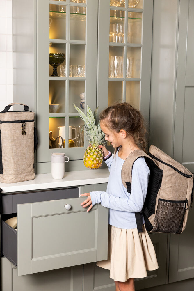 <p>Praktyczna i sportowa torba termiczna wykonana z beżowego materiału rPET. Stylowe detale w kolorze beżowym i czarnym. Nieco wyższy model, który idealnie pomieści na przykład dwie butelki wina lub butelki PET o pojemności 1,5 litra. Wyposażona w uchwyt do przenoszenia oraz regulowany pasek na ramię. Wodoodporne szwy wewnątrz. Materiał wierzchni wykonany z rPET (Recycled PET), czyli z recyklingowanych butelek PET.</p> <p> </p> <p>Materiał: rPET / poliester / PEVA</p> <p>Waga: 900 g</p> <p>Szerokość: 11 cm; Wysokość: 35 cm; Długość: 24 cm</p> <p>Pojemność: 9 L</p> <p>Wycierać miękką ściereczką.</p>