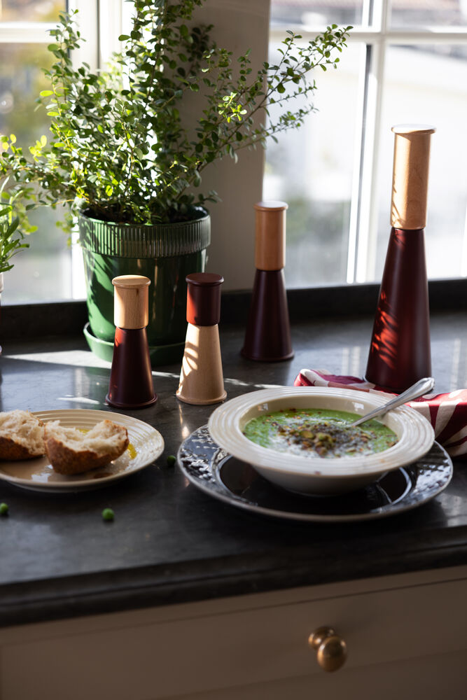 <p>Gurken Medium to ponadczasowy młynek do każdego domu, zaprojektowany we współpracy z Danielem Enokssonem. Gurken to młynek do soli i pieprzu inspirowany majestatycznym górskim krajobrazem. Dzięki wysokości 20,5 cm doskonale pasuje do każdej kuchni i staje się stylowym elementem codzienności. Stożkowa forma zapewnia stabilność i ponadczasową estetykę, a sam młynek jest jednocześnie funkcjonalny i dekoracyjny. Wykonany z certyfikowanego drewna bukowego i wyposażony w trwały, ceramiczny mechanizm mielący ze stali nierdzewnej, gwarantuje równomierne mielenie oraz możliwość regulacji grubości. Gurken Medium dostępny jest w dwóch wersjach kolorystycznych i należy do rodziny Gurken. Projekt: Daniel Enoksson x Sagaform. Dostarczany w eleganckim, okrągłym pudełku prezentowym. </p> <p>Wytrzeć miękką ściereczką</p> <p>Bezpieczny dla żywności</p> <p> </p> <p>Materiał: Certyfikowany buk / stal nierdzewna 304 / ceramika / PP</p> <p>Waga: 250 g</p> <p>Szerokość: 7,5 cm; Wysokość: 20,5 cm; Długość: 7,5 cm</p> <p>Kolor: Ciemnoczerwony/brązowy</p>