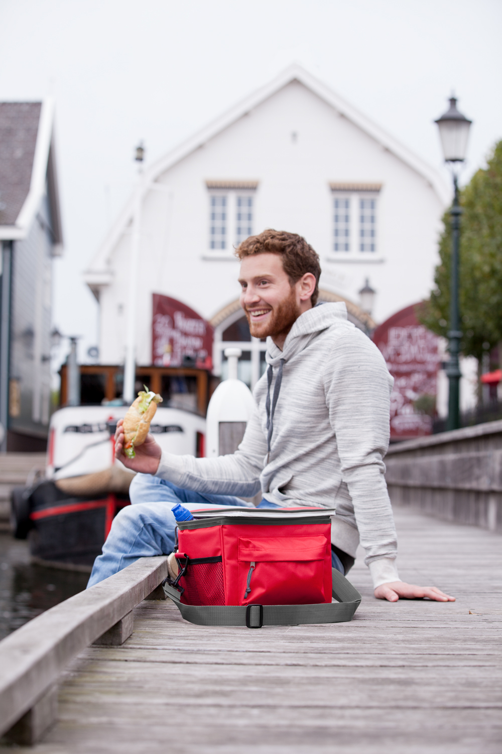 Torba termoizolacyjna z kieszenią przednią i główną na zamek, 2 siateczkowe kieszenie boczne, uchwyt, regulowany pasek na ramię