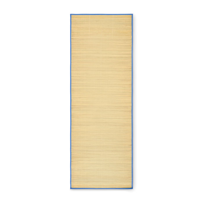 Zwijana mata plażowa z naturalnej słomy z poliestrowym paskiem do przenoszenia.