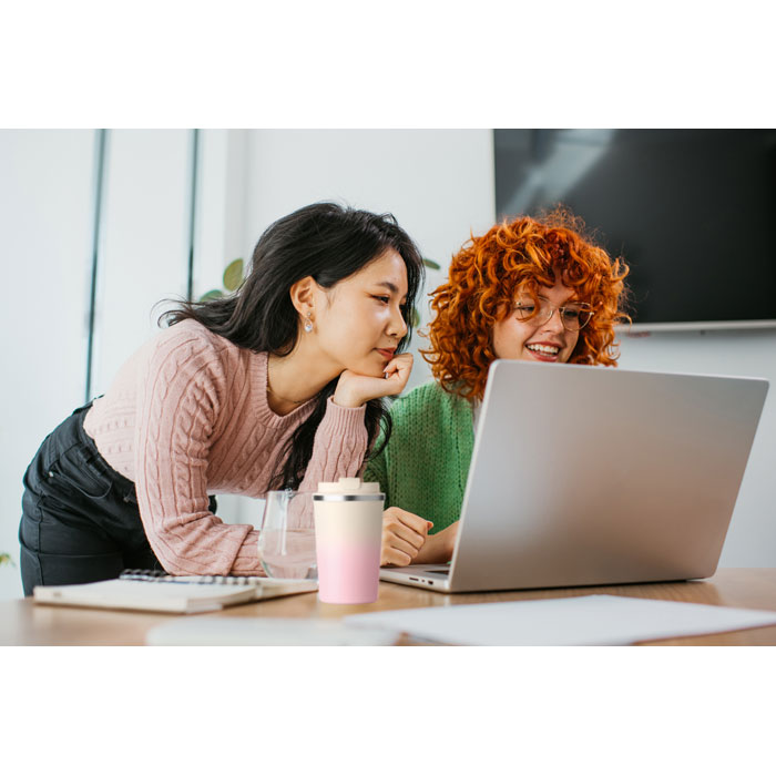 Kubek o podwójnych ściankach z recyklingowanej stali nierdzewnej (90% stali nierdzewnej z recyklingu i 10% stali nierdzewnej) z pokrywką z PP. Pojemność: 350 ml. Nie przecieka.
