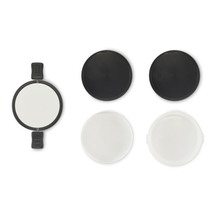 Dwupoziomowe okrągły lunchbox wykonane z PP z bocznym zamknięciem na zatrzask i uchwytami. Zawiera wewnętrzne pokrywki. Pojemność 250 ml na górze, 700 ml na dole.