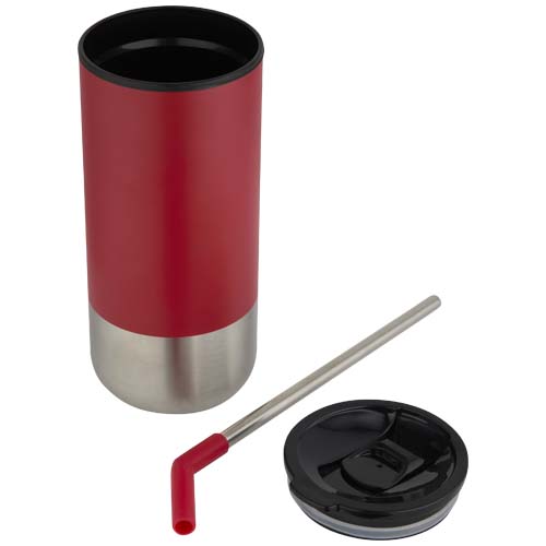 Ten kubek termiczny o podwójnych ściankach jest wyposażony w słomkę ze stali nierdzewnej z recyklingu, zakończoną silikonową końcówką zapewniającą wygodę użytkowania. Wewnętrzna ścianka jest wykonana z polipropylenu, a ścianka zewnętrzna ze stali nierdzewnej z recyklingu z certyfikatem RCS. Przesuwana pokrywa wykonana z tworzywa PS i plastiku ABS w połączeniu z matową powłoką nadaje kubkowi eleganckie wykończenie. Pojemność: 480 ml.