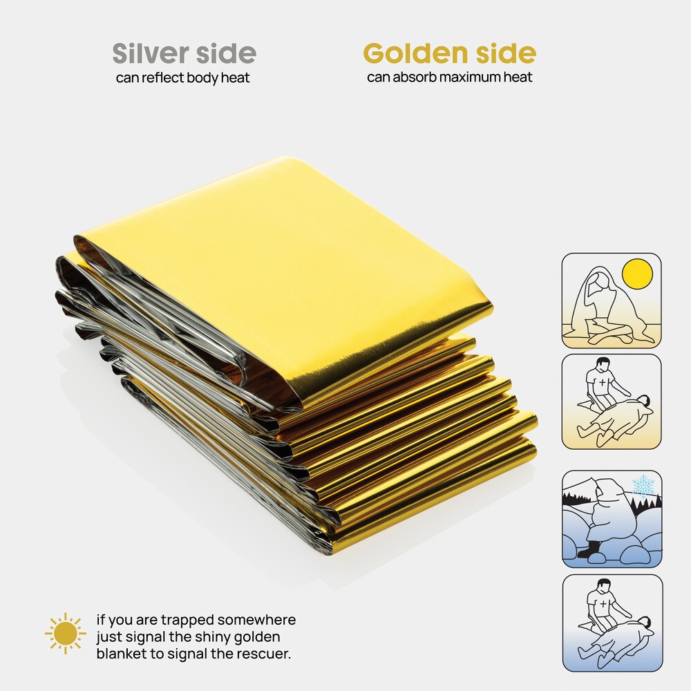 Koc ratunkowy, termoizolacyjny, wielokrotnego użytku, zgodny z normą EN ISO 15223-1:2021, wykonany z materiałów z recyklingu, całkowita zawartość materiałów z recyklingu obliczona na podstawie masy całkowitej produktu: 35%