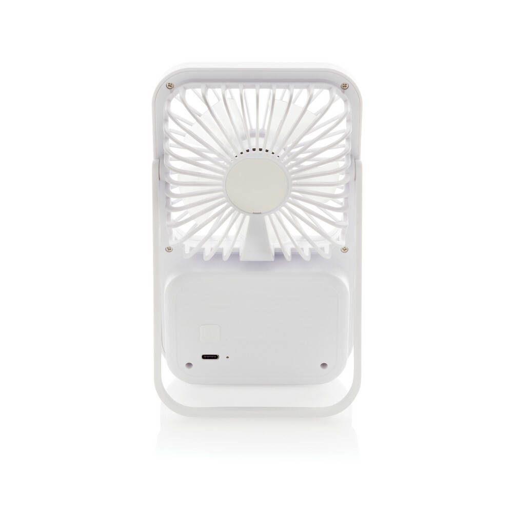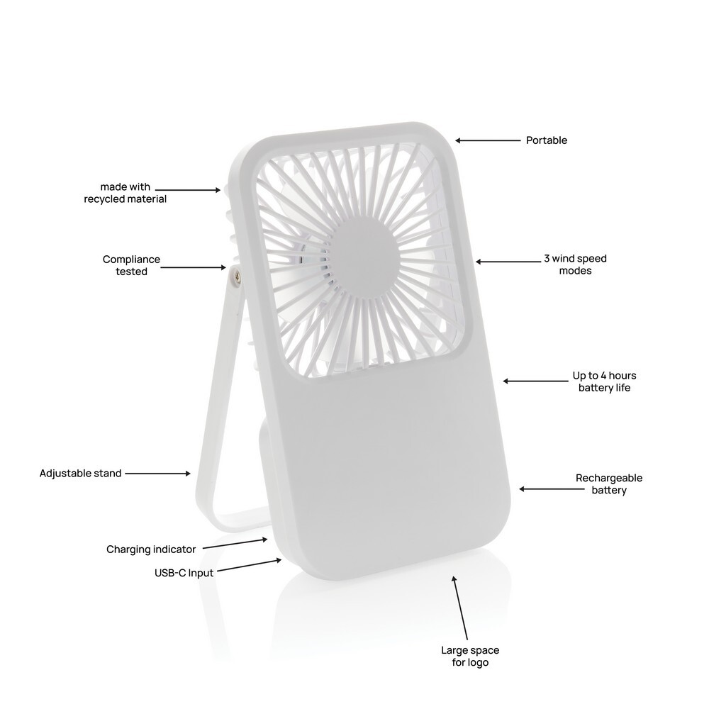 Wentylator kieszonkowy, wentylator biurkowy, wykonany z ABS z recyklingu, do 3 godzin działania na jednym ładowaniu, kabel w komplecie, całkowita zawartość materiałów z recyklingu obliczona na podstawie masy całkowitej produktu: 58%