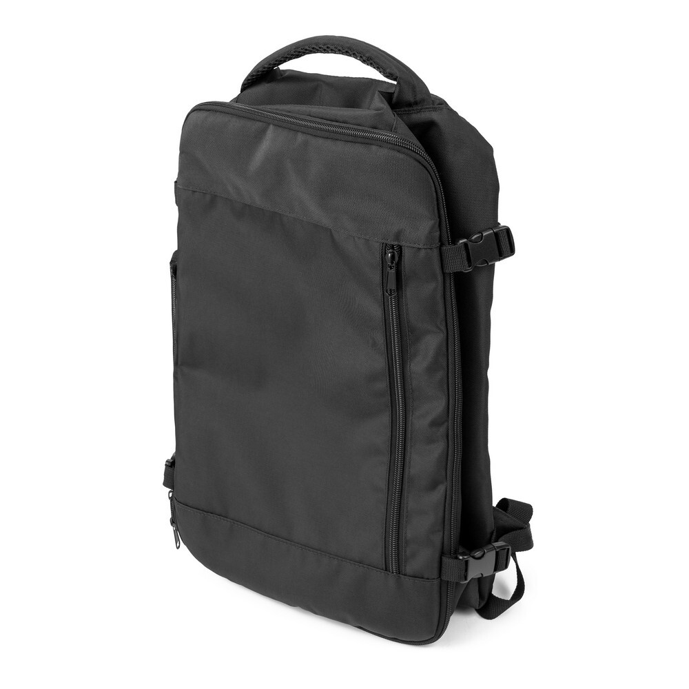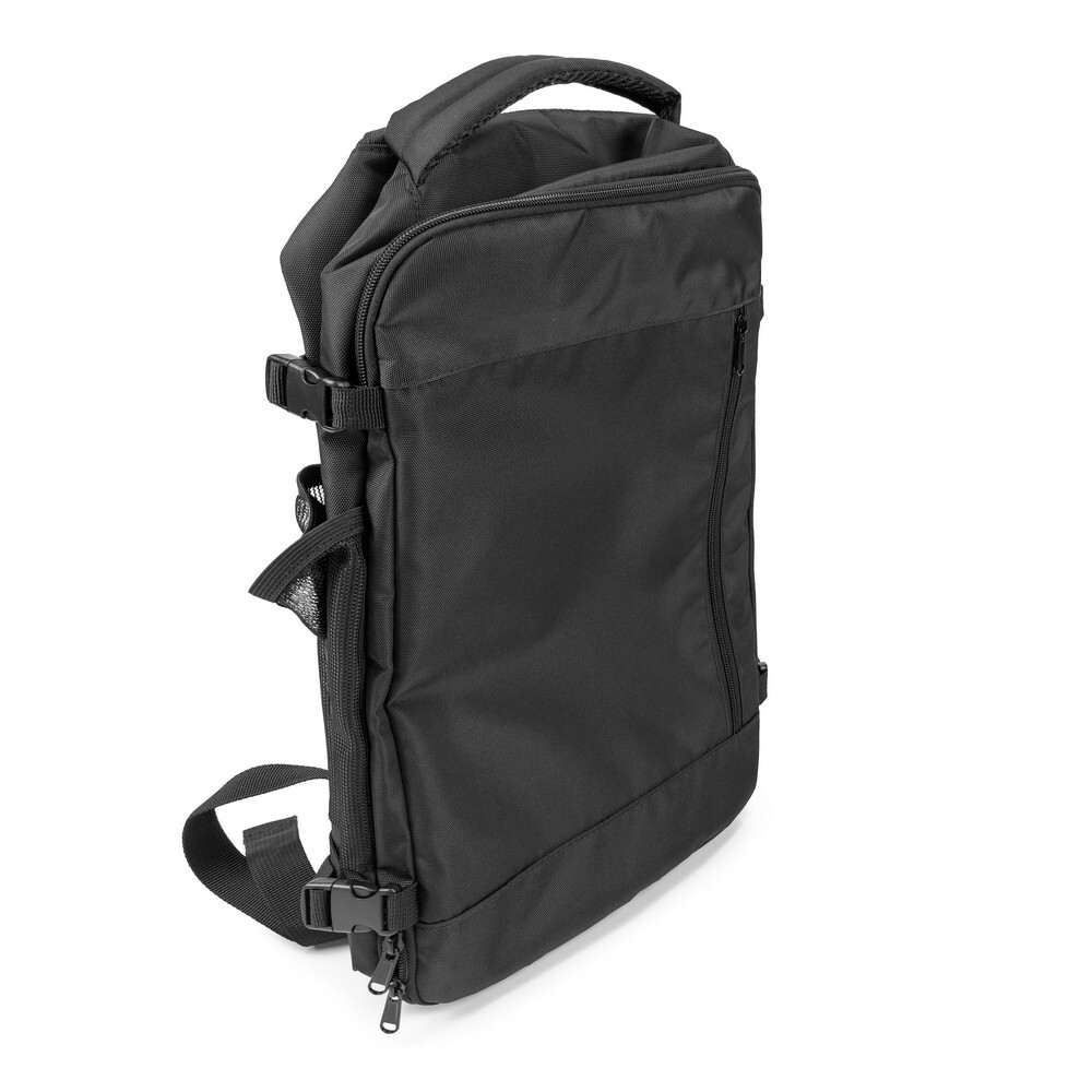 Plecak podróżny w formie bagażu osobistego, kabinowy, przeznaczony do umieszczenia pod siedzeniem w samolocie, pojemność 20L, jedna przegroda główna zamykana na zamek błyskawiczny, wewnątrz kieszeń z siatki zamykana na zamek, na zewnątrz dwie kieszenie zamykane na zamek oraz kieszeń na butelkę, dwa regulowane paski kompresyjne ułatwiają stabilizację plecaka, na plecach pas umożliwiający zaczepienie o rączkę walizki, miękkie i regulowane paski na ramię umożliwiają dopasowanie długości
