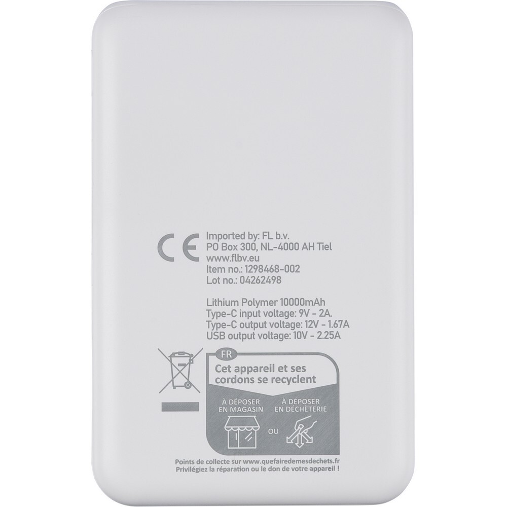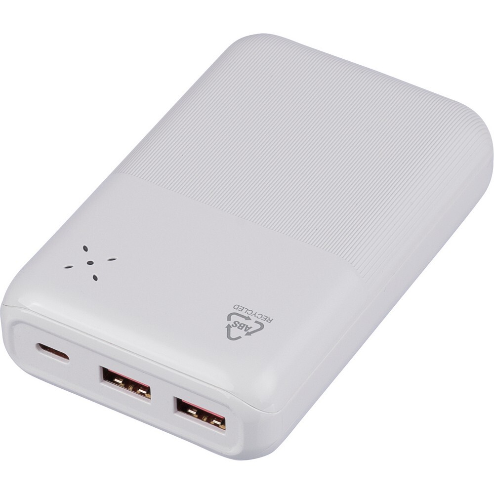 Power bank o mocy 22,5W i pojemności 20000 mAh z baterią litowo-jonową, wejście i wyjście typu C, wejście typu A, etykieta informacyjna z tyłu, ikona RABS na produkcie, posiada zabezpieczenie przed przegrzaniem, zwarciem, przepięciem i przeciążeniem, zapakowany pojedynczo w brązowe kartonowe pudełko, produkt wykonany z ABS z recyklingu