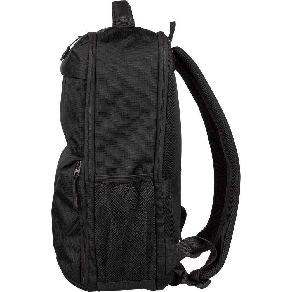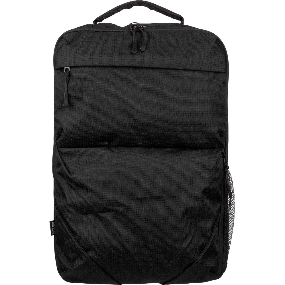 Plecak na laptopa 15" o pojemności 20 litrów, kieszeń główna zapinana na zamek, przegroda na laptopa 15", dwie małe kieszenie przednie zapinane na zamek, uchwyt ułatwiający noszenie, kieszeń boczna z siatką, wentylowane paski do noszenia na ramieniu, pasek do przymocowania do walizki, ikona OBP na metce, produkt wykonany z RPET 300D