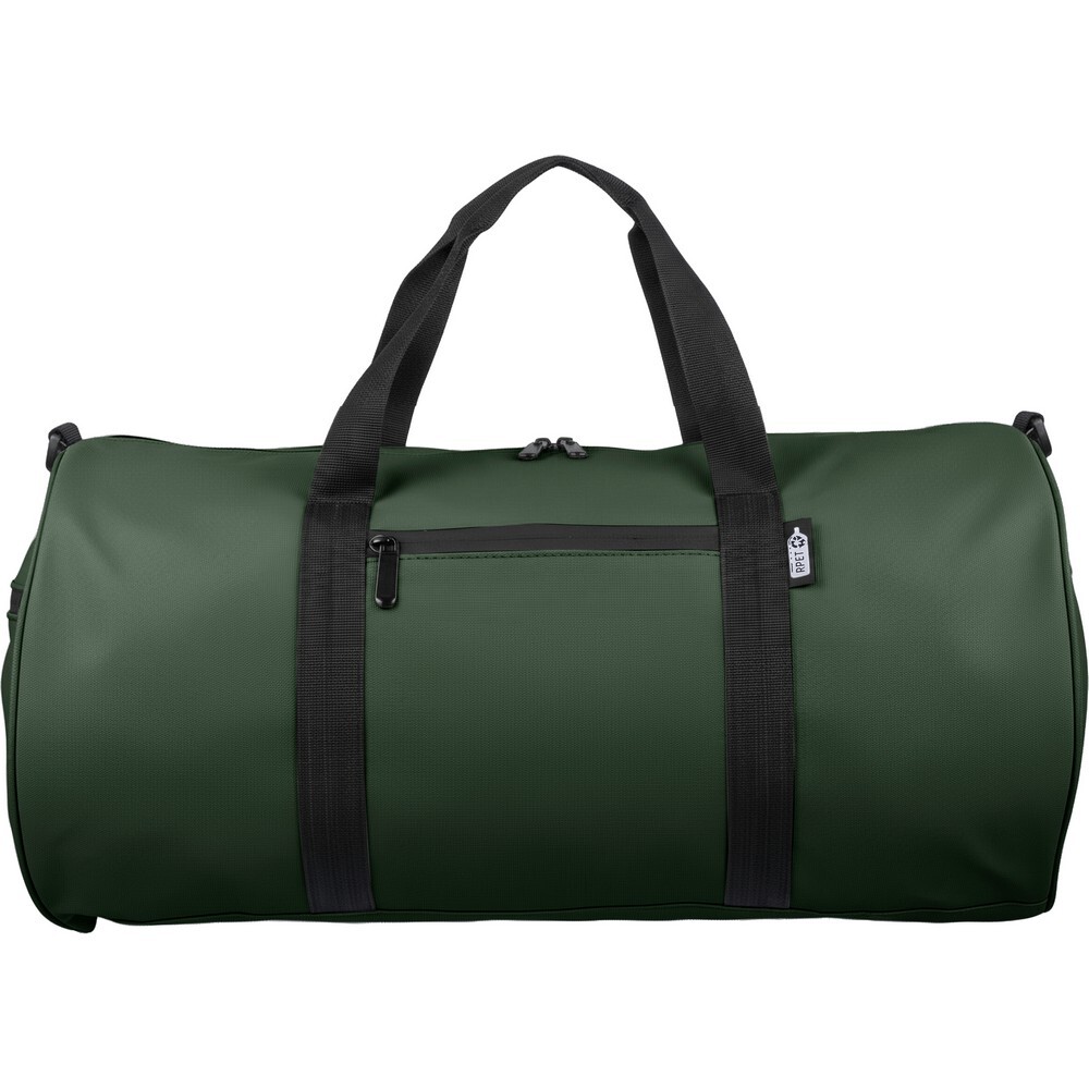 Torba sportowa, podróżna o pojemności 40 litrów, podszewka z poliestru 210D, powłoka wodoodporna, główna kieszeń zapinana na zamek, mała przednia kieszeń zapinana na zamek, kieszeń boczna zapinana na zamek, kieszeń boczna z siatką, dwa uchwyty do noszenia, posiada długi pasek umożliwiający noszenie na ramieniu, ikona RPET na metce, produkt wykonany z RPET 600D i PU