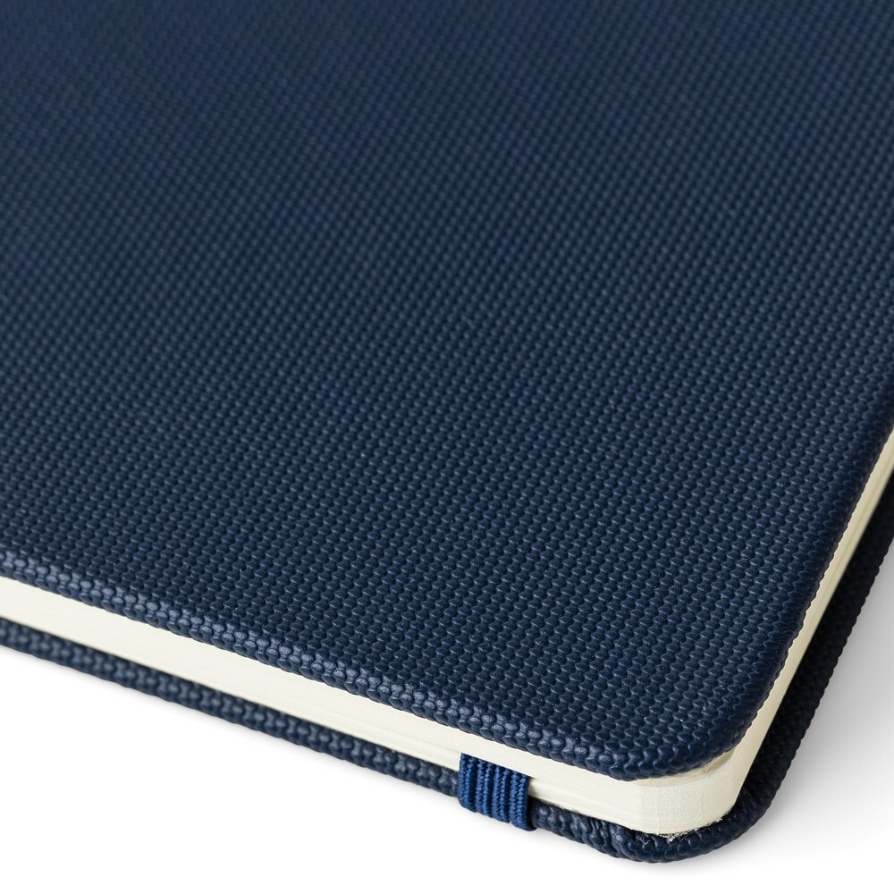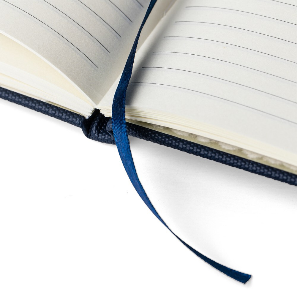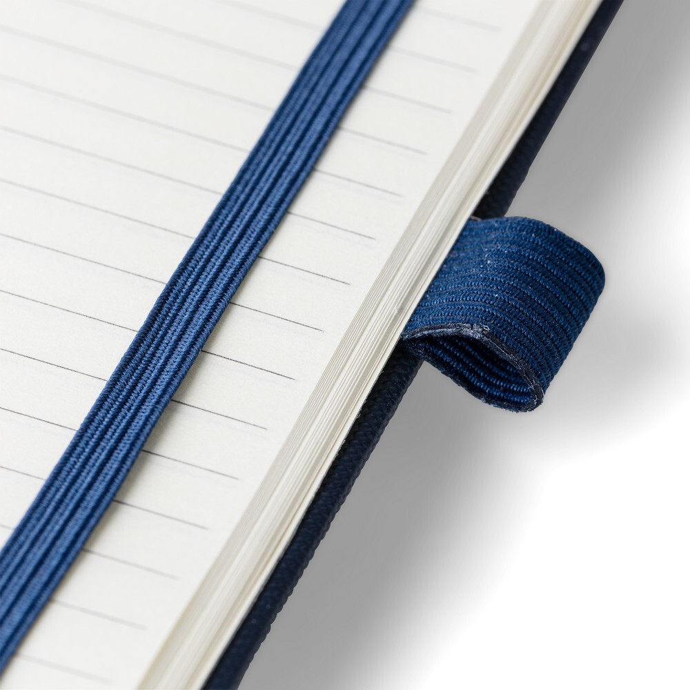 Notatnik w formacie A5, 70 g/m², posiada 70 kartek w linie, tasiemka zakładkowa umożliwia wygodne zaznaczanie ostatniej strony lub ważniejszych notatek, dodatkowe zamknięcie w postaci dopasowanej kolorystycznie elastycznej opaski, sznurek do przywiązania długopisu, ikona recyklingu z tyłu, produkt wykonany z RPET 600D i papieru
