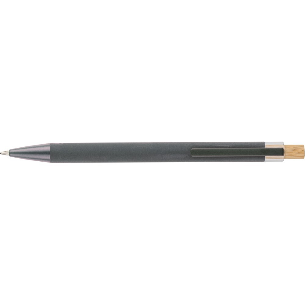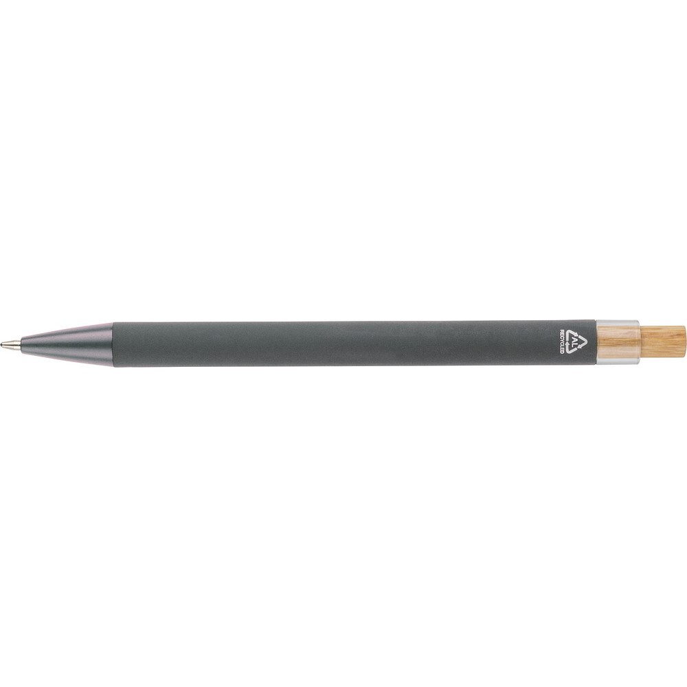 Długopis, bambusowy przycisk, metalowy klips, wkład w niebieskim kolorze, ikona recyklingu na produkcie, wystarcza na ok. 800 m pisania, produkt wykonany z ABS z recyklingu, aluminium i bambusa