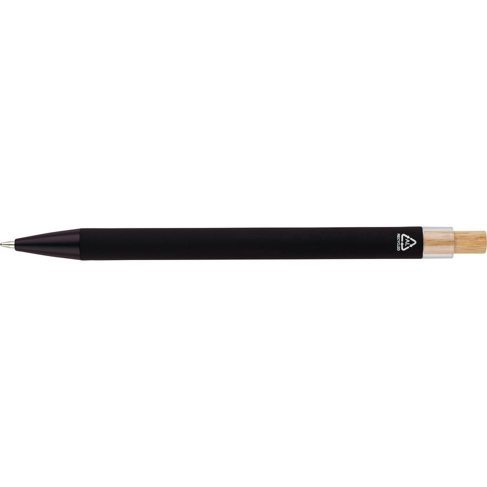 Długopis, bambusowy przycisk, metalowy klips, wkład w niebieskim kolorze, ikona recyklingu na produkcie, wystarcza na ok. 800 m pisania, produkt wykonany z ABS z recyklingu, aluminium i bambusa