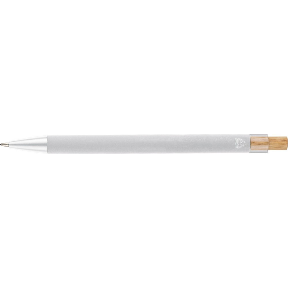 Długopis, bambusowy przycisk, metalowy klips, wkład w niebieskim kolorze, ikona recyklingu na produkcie, wystarcza na ok. 800 m pisania, produkt wykonany z ABS z recyklingu, aluminium i bambusa