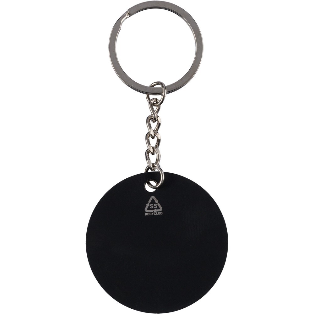 Okrągły brelok do kluczy w kształcie piłki nożnej, ikona recyklingu na produkcie, zapakowany w kraftową kopertę, produkt wykonany ze stali nierdzewnej z recyklingu