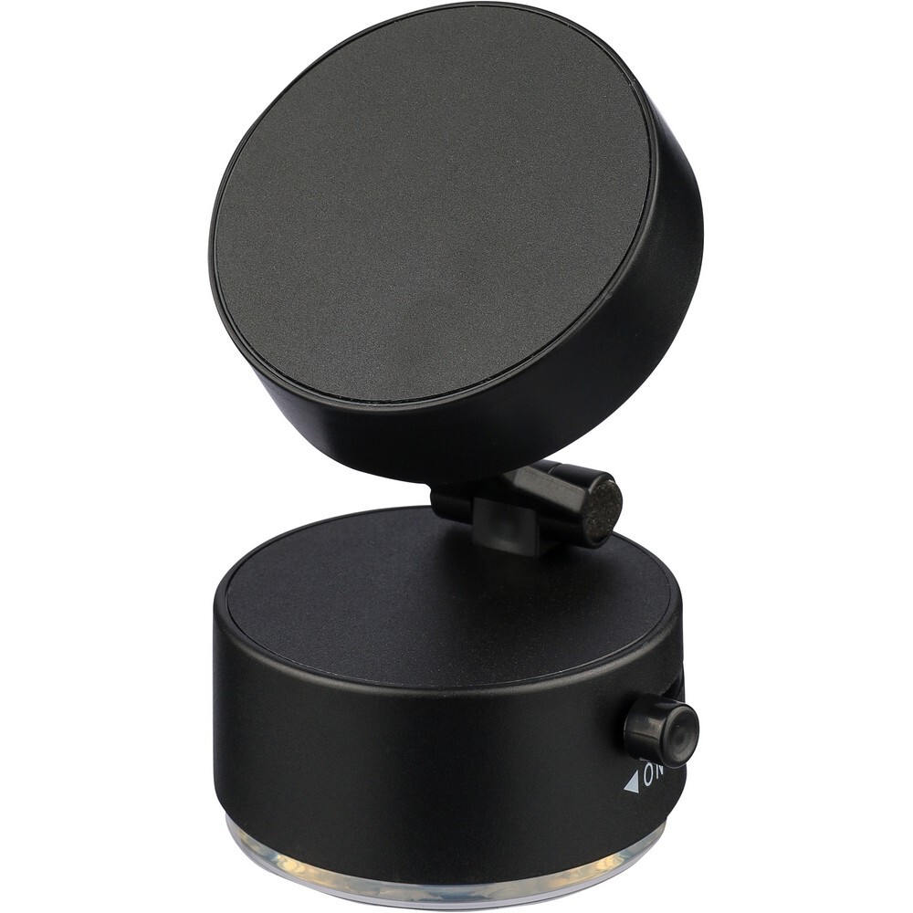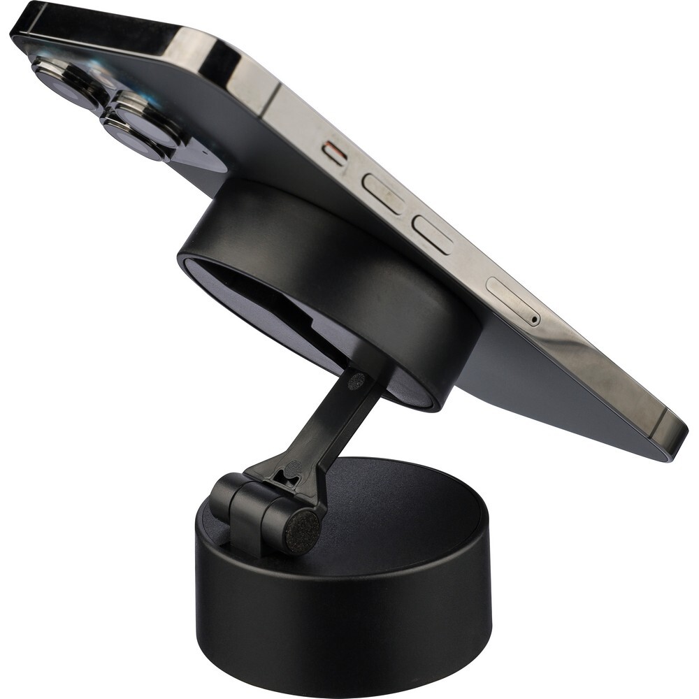 Stojak na telefon MagSafe z funkcją blokady przyssawki na spodzie, zestaw zawiera metalowy pierścień, dzięki czemu pasuje do wszystkich telefonów, ikona recyklingu na produkcie, zapakowany pojedynczo w brązowe kartonowe pudełko produkt wykonany z recyklingowego ABS