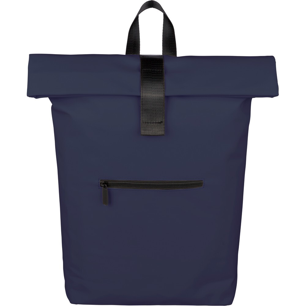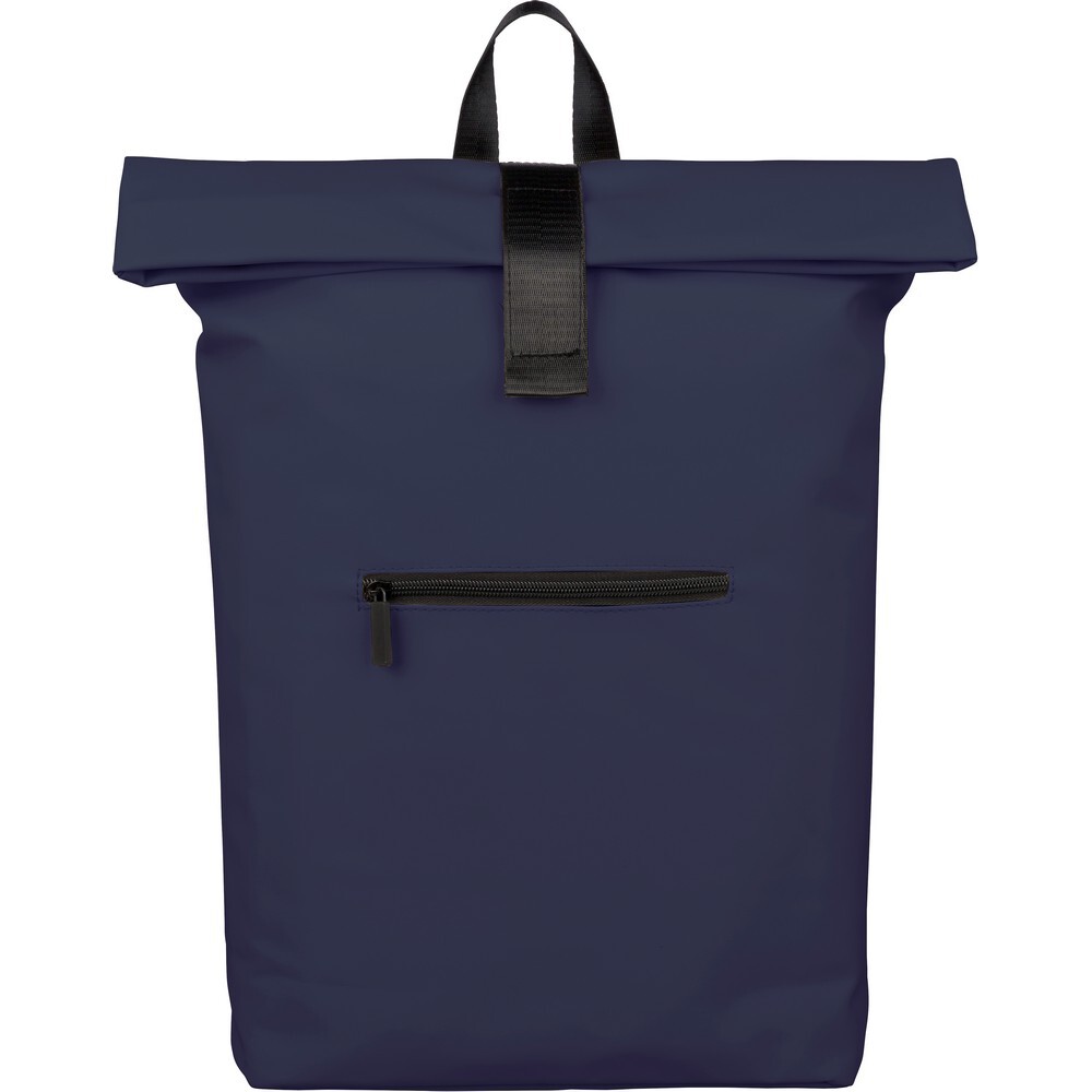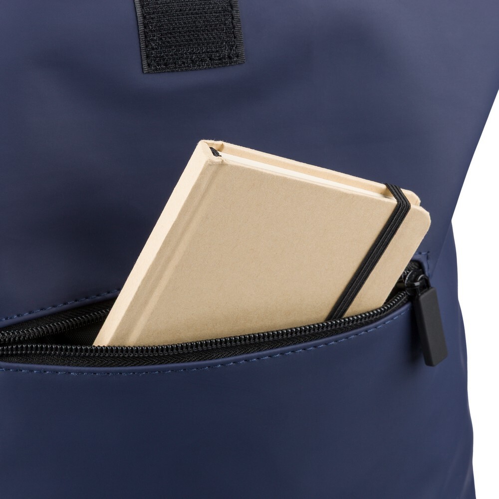 Zwijany plecak o pojemności 19 litrów, mała kieszeń zapinana na zamek z przodu, zwijana główna kieszeń zamykana na rzep, przegroda na laptopa 16" w środku, regulowane wentylowane paski na ramię, uchwyt z wierzchu ułatwiający noszenie, podszewka z poliestru 210D, ikona recyklingu na metce, produkt wykonany z PU z recyklingu i poliestru