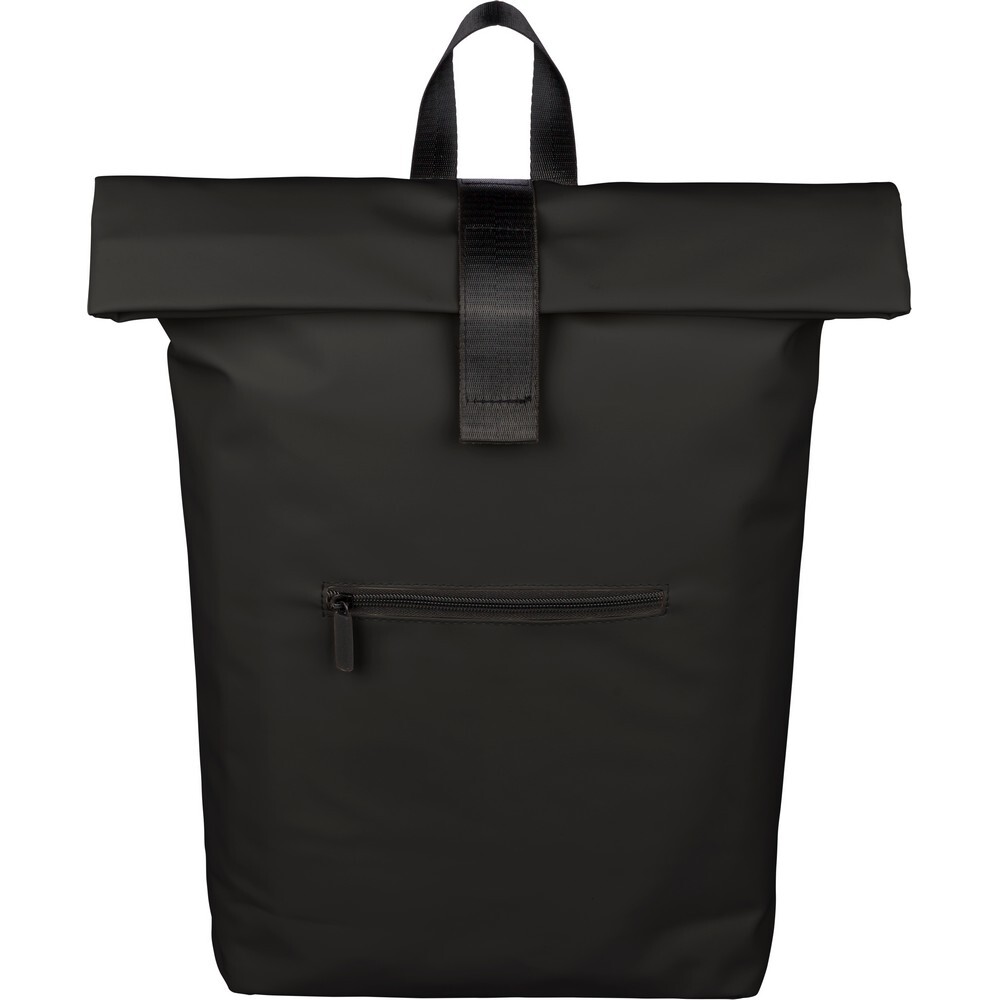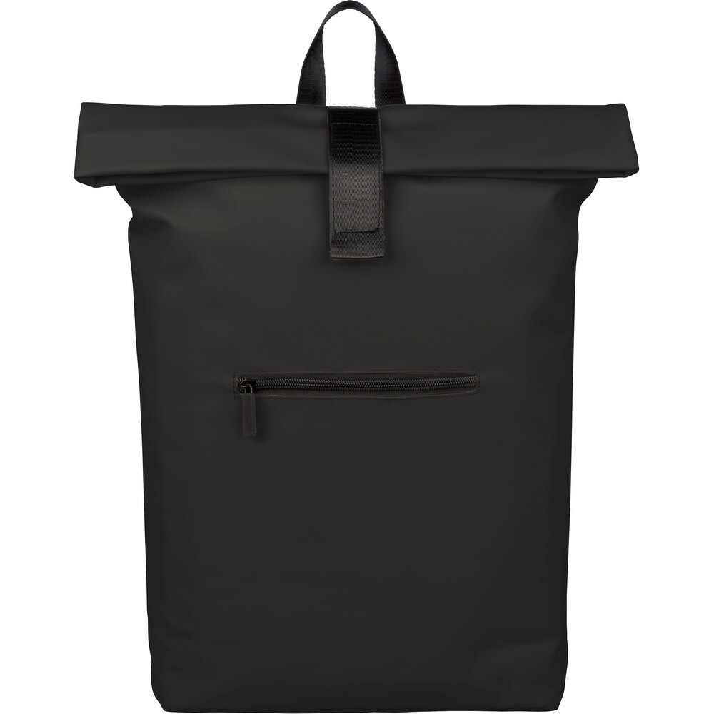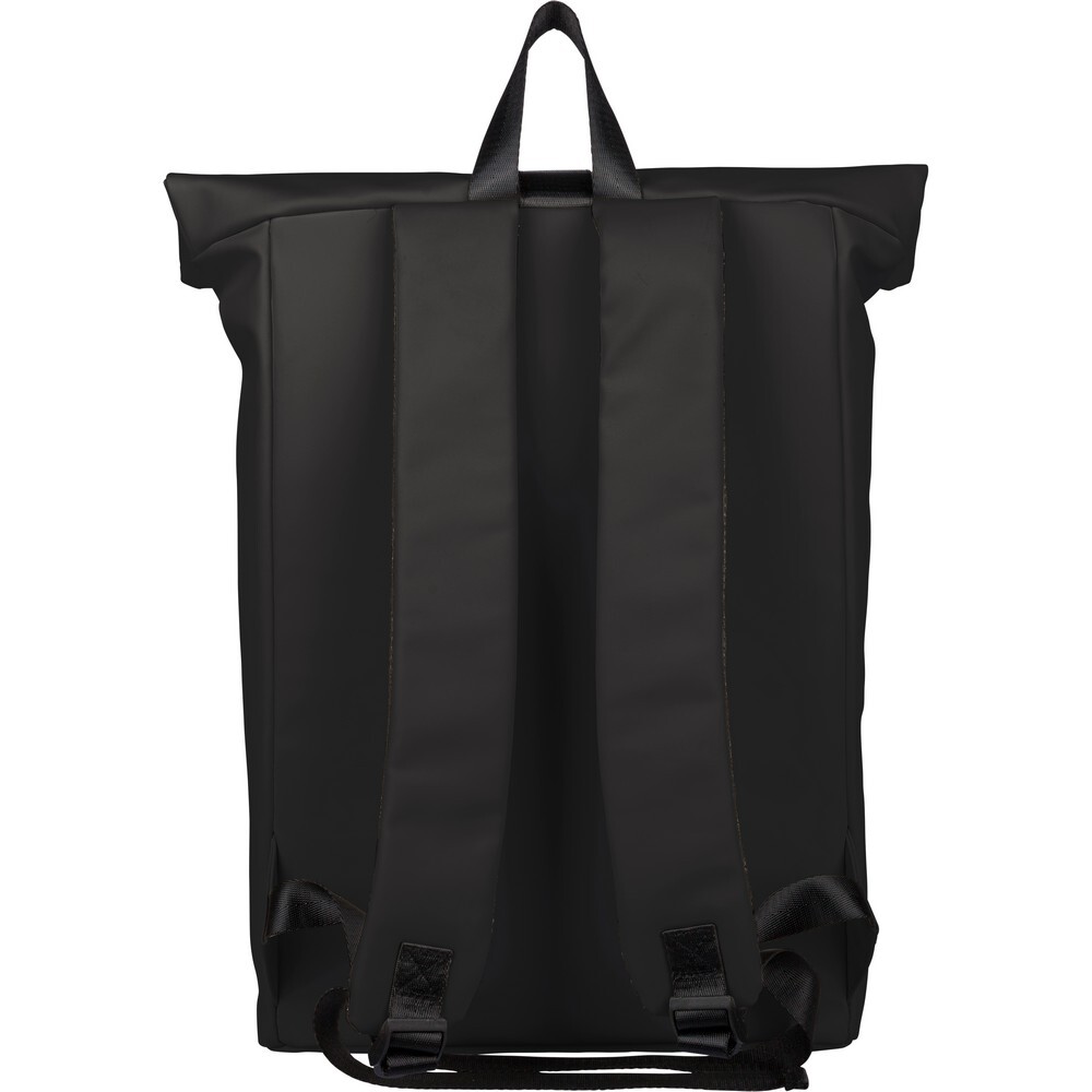 Zwijany plecak o pojemności 19 litrów, mała kieszeń zapinana na zamek z przodu, zwijana główna kieszeń zamykana na rzep, przegroda na laptopa 16" w środku, regulowane wentylowane paski na ramię, uchwyt z wierzchu ułatwiający noszenie, podszewka z poliestru 210D, ikona recyklingu na metce, produkt wykonany z PU z recyklingu i poliestru