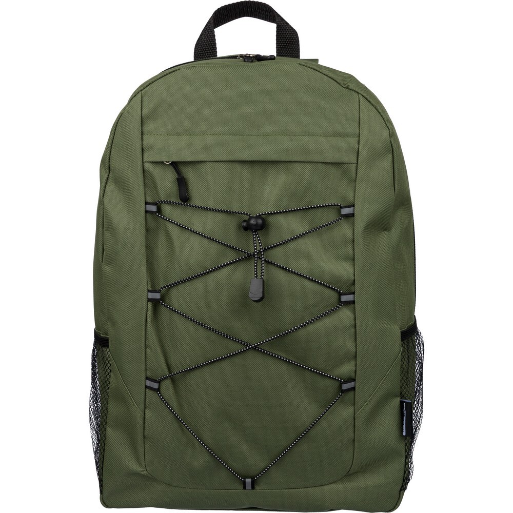 Plecak podróżny, siatkowate kieszenie po obu stronach, elastyczne sznurki z przodu do przymocowania butelki albo koca, zaciskane zamknięcie, mała kieszeń zapinana na zamek z przodu, kieszeń główna zapinana na zamek, ikona RPET na metce, produkt wykonany z RPET, poliestru i elastanu