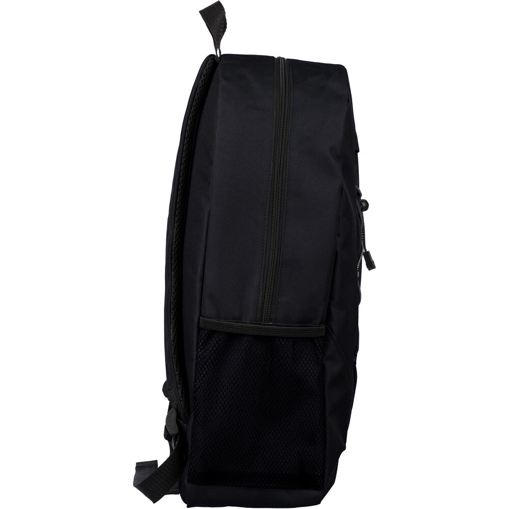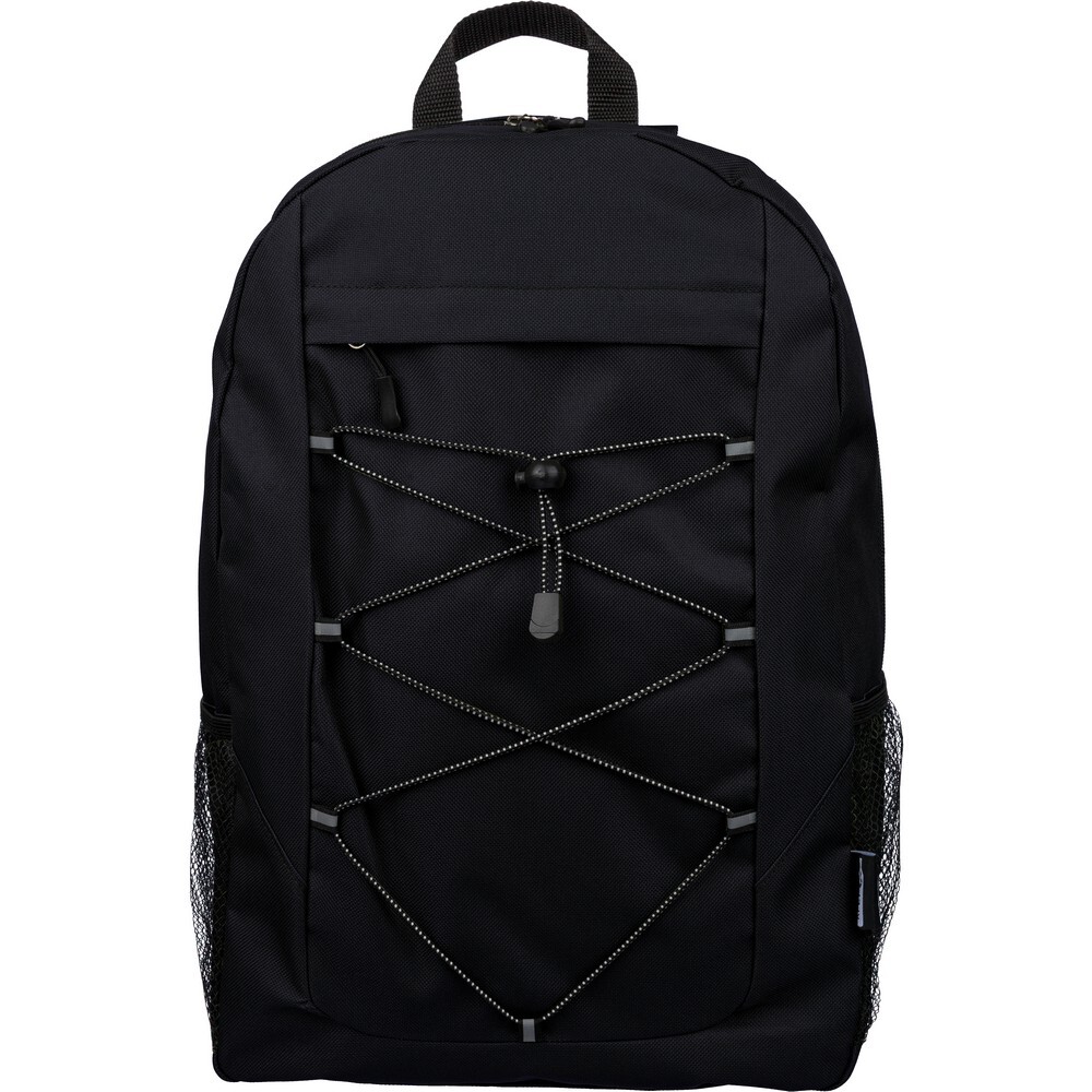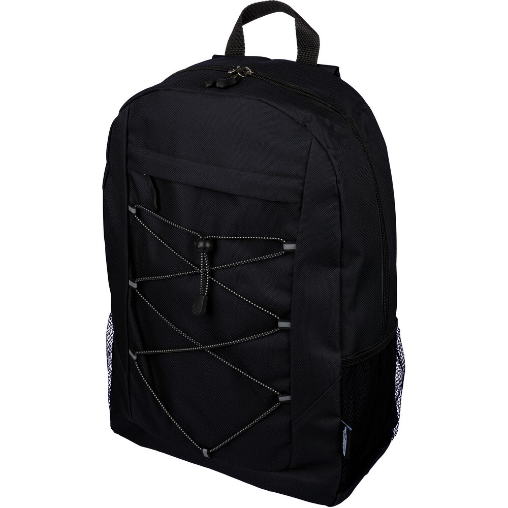 Plecak podróżny, siatkowate kieszenie po obu stronach, elastyczne sznurki z przodu do przymocowania butelki albo koca, zaciskane zamknięcie, mała kieszeń zapinana na zamek z przodu, kieszeń główna zapinana na zamek, ikona RPET na metce, produkt wykonany z RPET, poliestru i elastanu