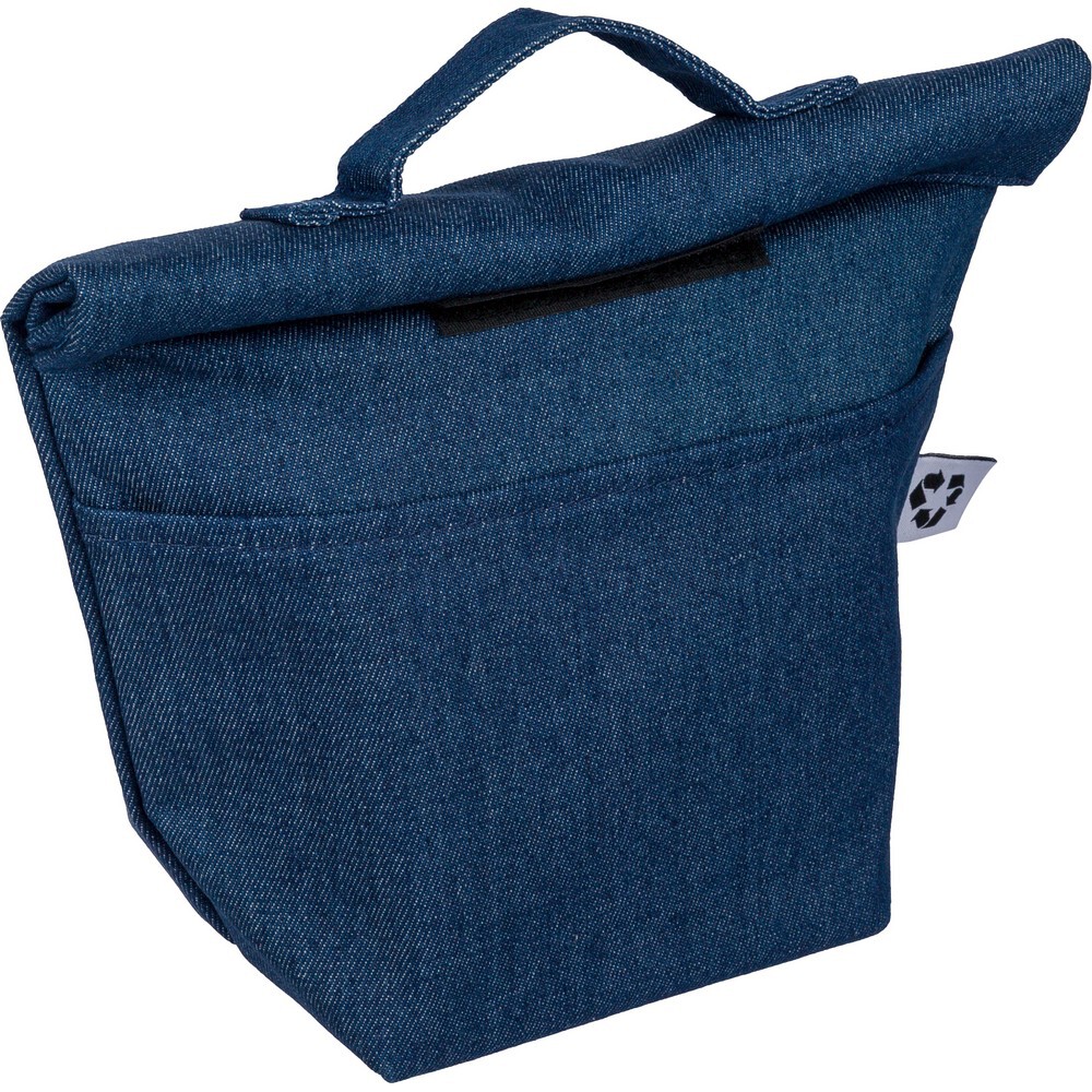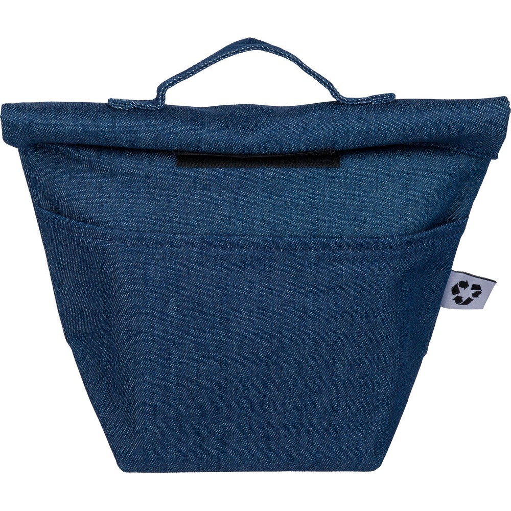 Torba termoizolacyjna o pojemności ok. 8 litrów, krótki uchwyt do noszenia, kieszeń z przodu, zapięcie na rzep, PEVA w środku, ikona recyklingu, produkt wykonany z denimu z recyklingu