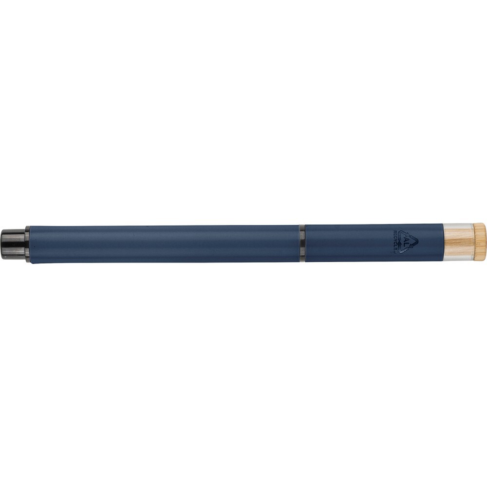 Zestaw piśmienniczy, w którego w skład wchodzi: długopis z bambusowym przyciskiem, ikoną recyklingu na produkcie, metalowym klipsem, tusz w niebieskim kolorze, wystarczający na ok. 700 m pisania, pióro kulkowe z pokrywką, metalowym klipsem, ikoną recyklingu na produkcie, wkład w niebieskim kolorze, wystarczający na ok. 500 m pisania, zapakowany w kolorowe pudełko upominkowe z recyklingu, produkt wykonany z aluminium z recyklingu, RPET i metalu