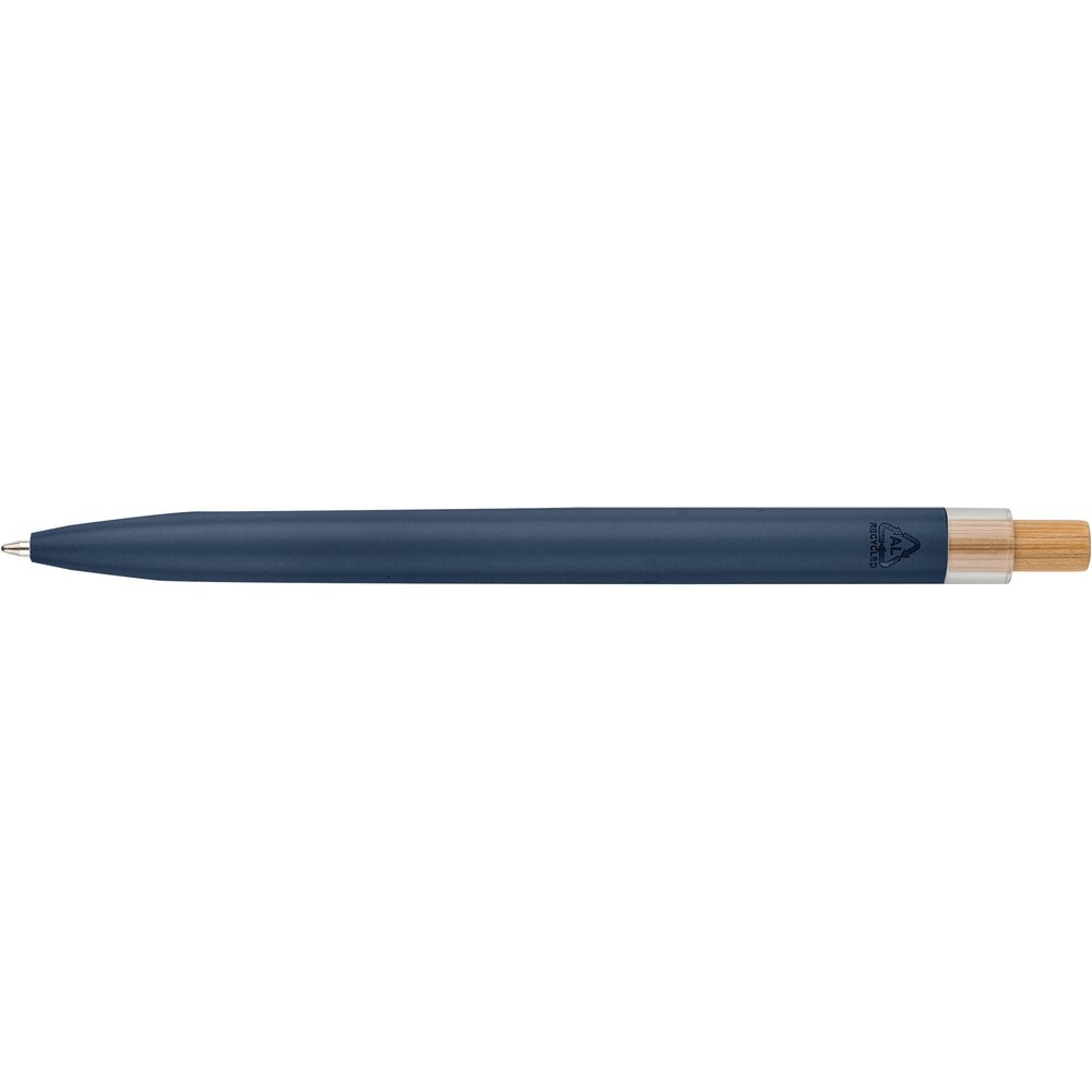 Długopis, wkład w niebieskim kolorze, wystarcza na ok. 700 m pisania, ikona recyklingu na produkcie, produkt wykonany z aluminium, RPET i z przyciskiem z bambusa