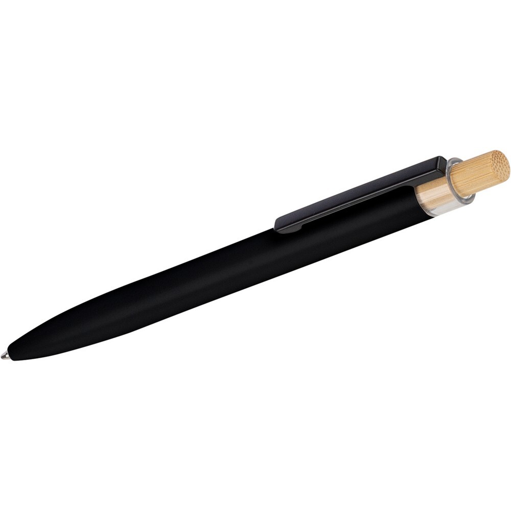 Długopis, wkład w niebieskim kolorze, wystarcza na ok. 700 m pisania, ikona recyklingu na produkcie, produkt wykonany z aluminium, RPET i z przyciskiem z bambusa