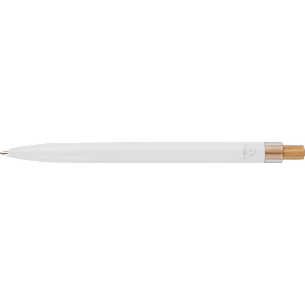 Długopis, wkład w niebieskim kolorze, wystarcza na ok. 700 m pisania, ikona recyklingu na produkcie, produkt wykonany z aluminium, RPET i z przyciskiem z bambusa