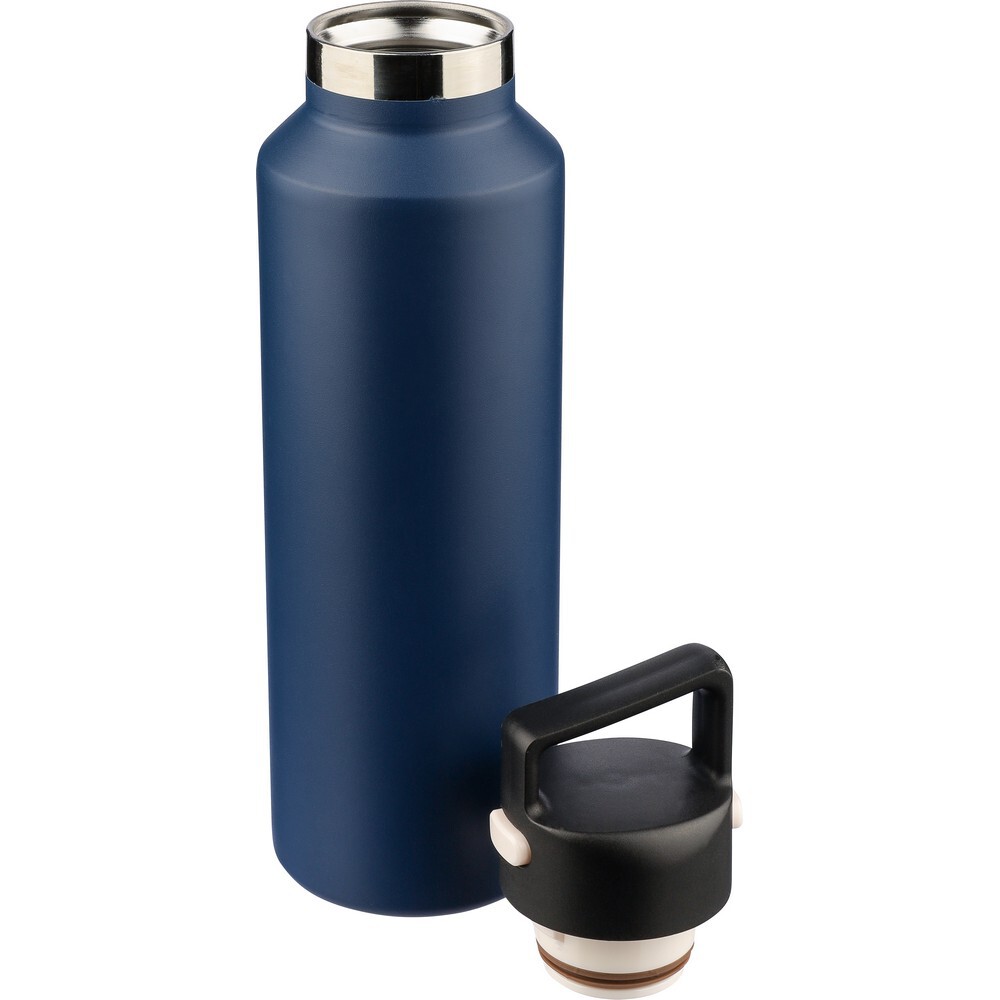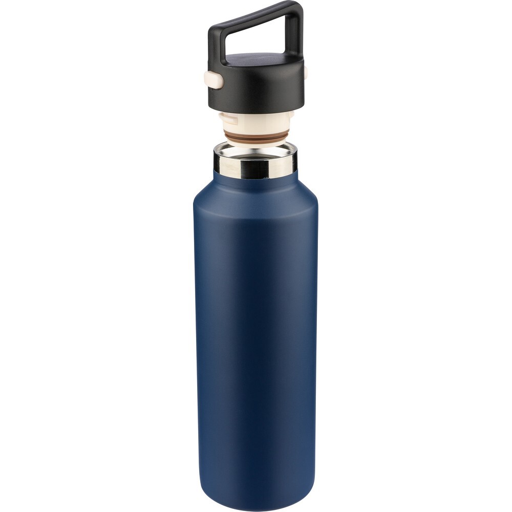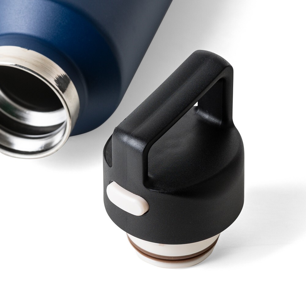 Kubek termiczny 600 ml, posiada podwójne ścianki ze stali nierdzewnej z próżnią między ściankami, co spowalnia oddawanie temperatury na zewnątrz, zachowując funkcje termosu, uchwyt ułatwiający przenoszenie, zawiera przyciski po bokach do otwierania pokrywki, pakowany pojedynczo w brązowe kartonowe pudełko, produkt wykonany z recyklingowej stali nierdzewnej (wewnątrz 304 / na zewnątrz 201) z pokrywką z PP
