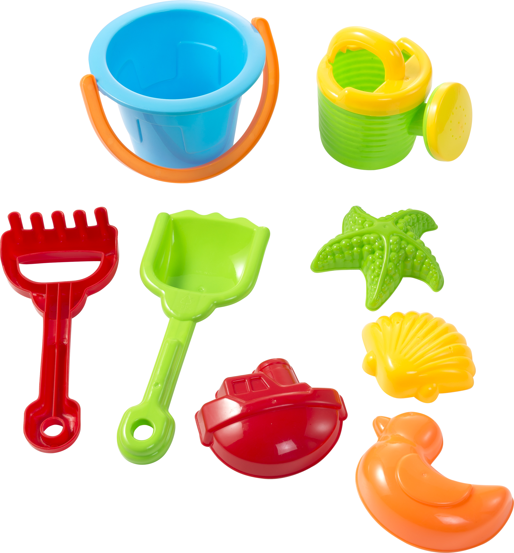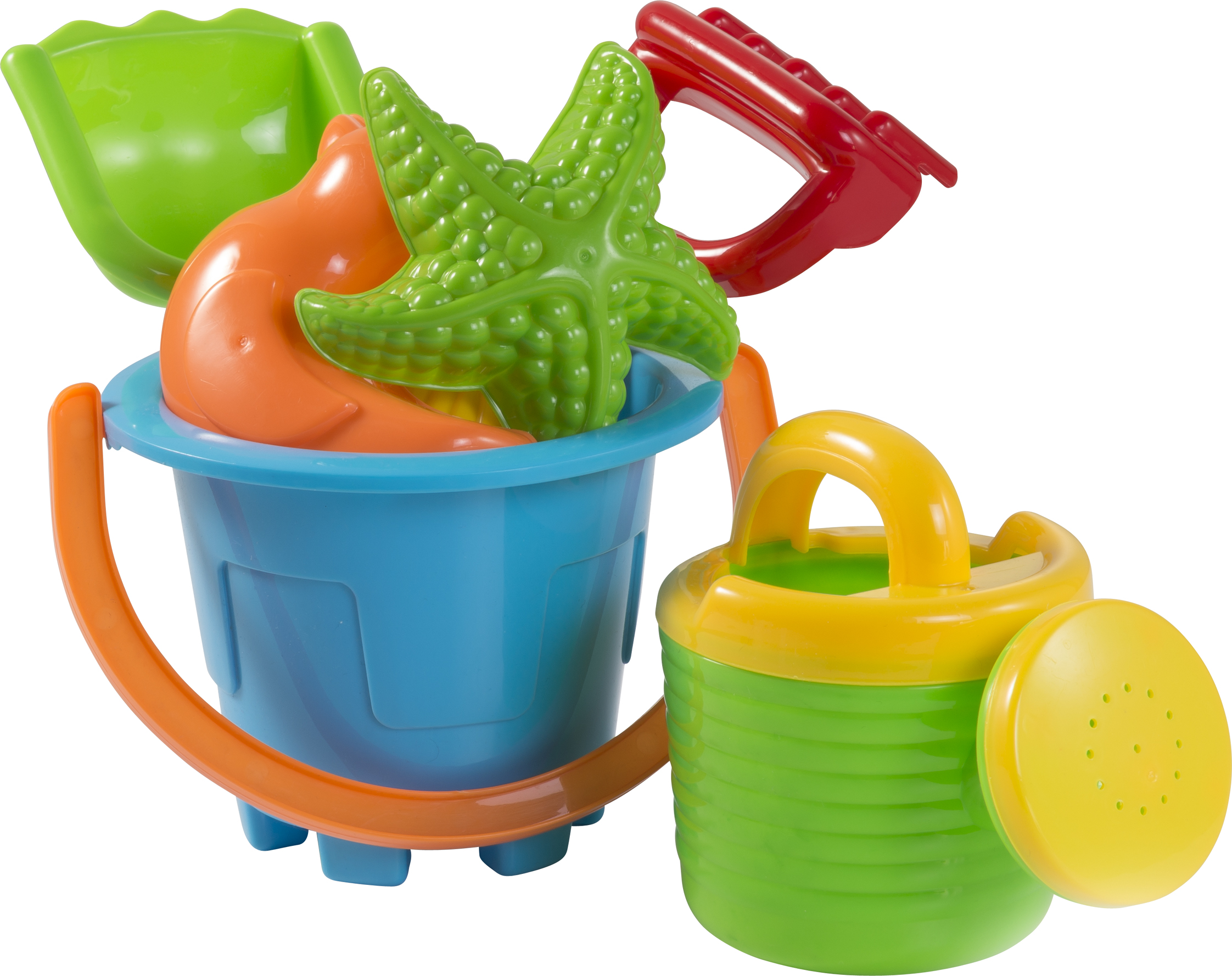 Wiaderko plażowe, łopatka, grabki, konewka (około 500 ml) i 4 foremki do piasku (kaczka, muszla, statek, rozgwiazda)