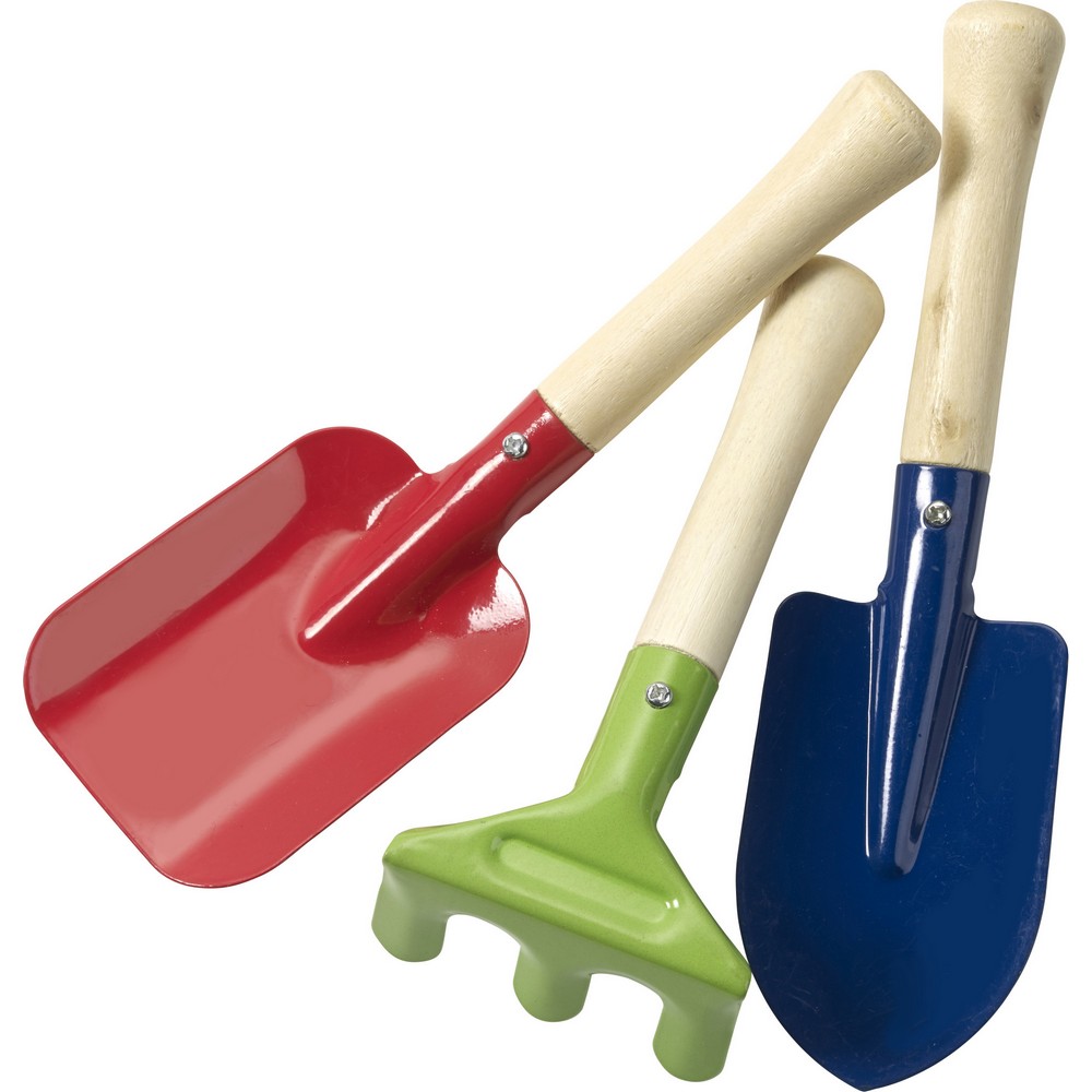 Zestaw ogrodowy: czerwona łopata, zielone grabie oraz niebieski szpadel