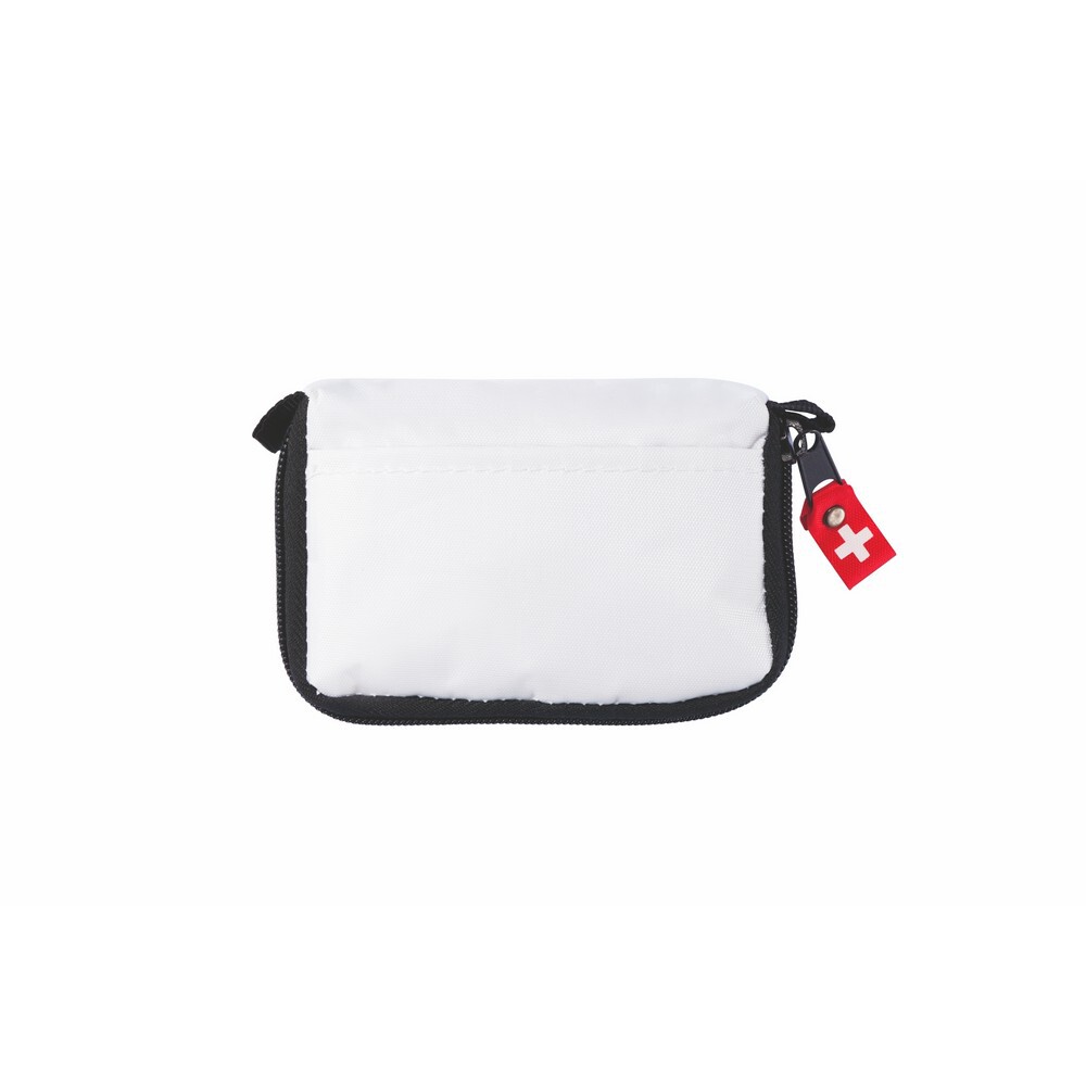 Apteczka w pokrowcu z przednią kieszonką i mocowaniem do paska, główna przegroda na zamek, zawiera: 2 bandaże, nożyczki, plastry, płatki nasączone alkoholem, agrafki oraz taśmę