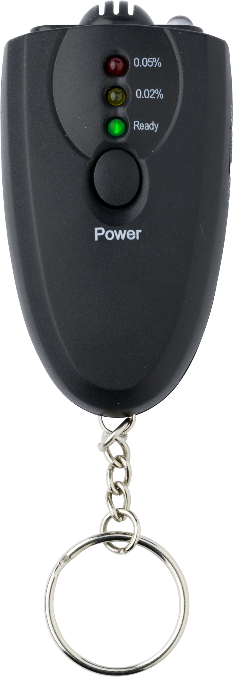 Alkomat z brelokiem, 3 światełka LED: zielone (gotowy), żółte (0,02%) i czerwone (0,05%), z przodu czerwona lampka LED
