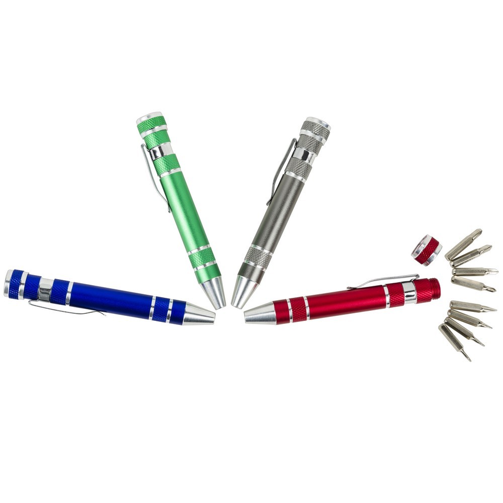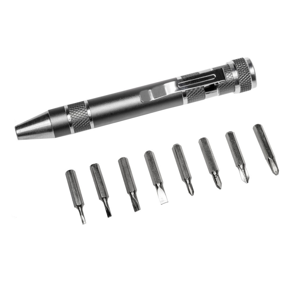 Śrubokręt w kształcie długopisu z 4 płaskimi i 4 krzyżakowymi końcówkami, z klipem