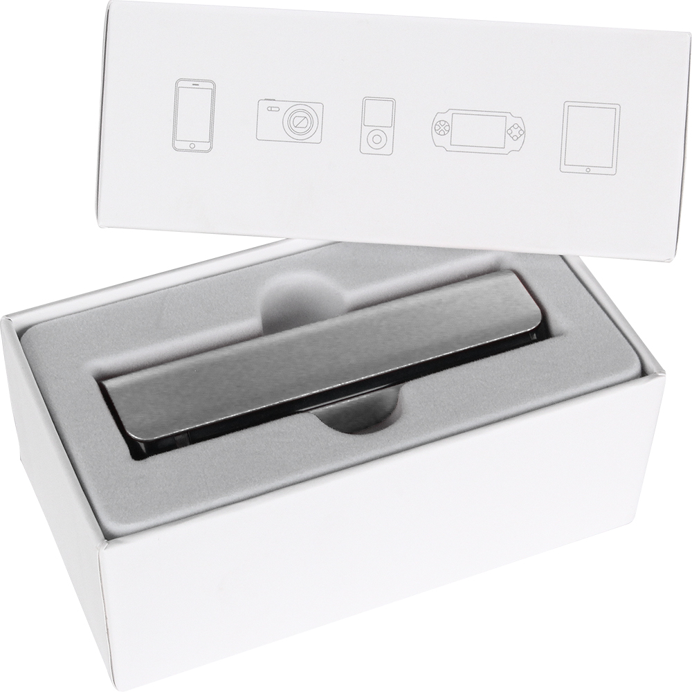 Powerbank został wykonany z anodowanego aluminium. Powerbank kieszonkowy dostępny jest w czterech kolorach: czarnym, czerwonym, srebrnym oraz niebieskim. Pojemność akumulatorka 2200 mAh. Do zestawu dołączony kabel micro USB/USB.